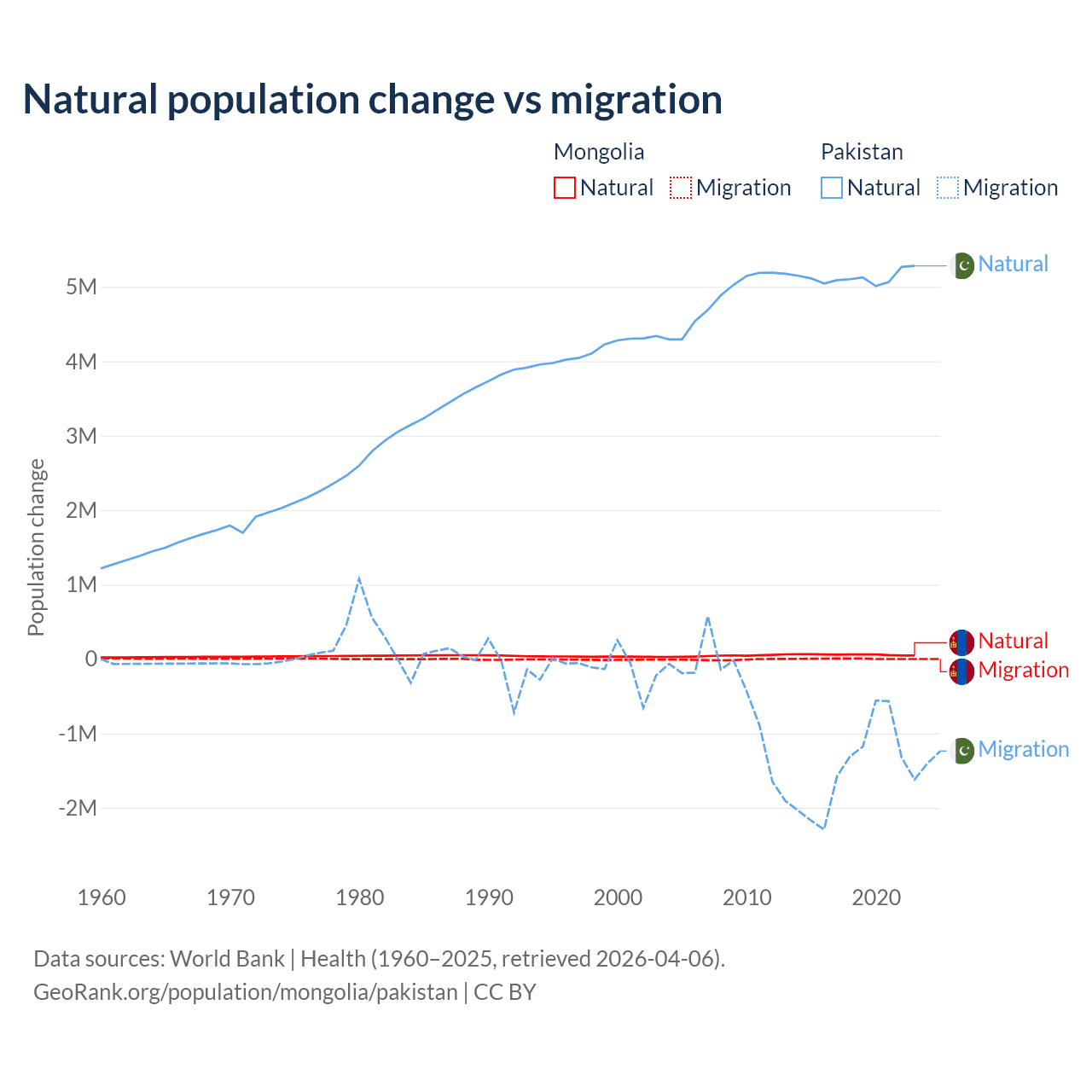 Over the last 10 years, 94.1% of the population change in Mongolia is from natural causes (a gain of 580,367 people) and 5.87% is from migration (a gain of 36,163 people). In Pakistan 77.8% is from natural causes (a gain of 51,255,404 people) and 22.2% is from migration (a loss of 14,629,055 people).