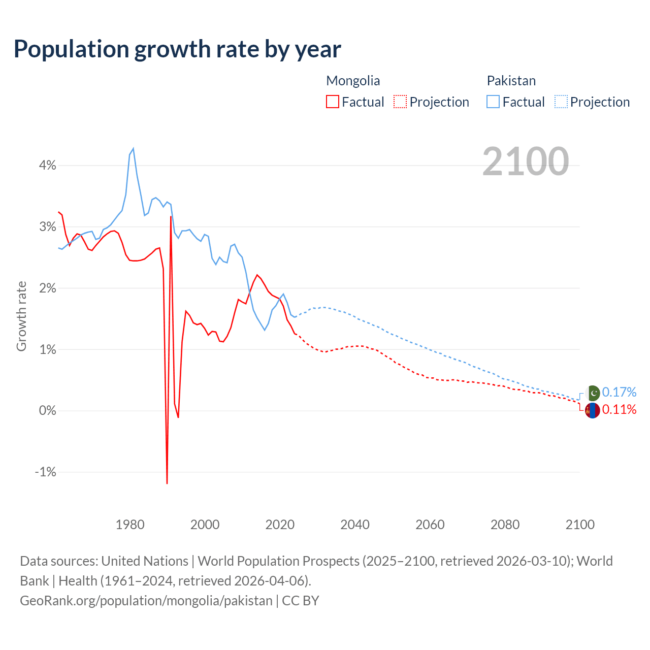 - For the last 10 years, Mongolia has had an average growth rate of +1.79% per year vs +1.6% in Pakistan.