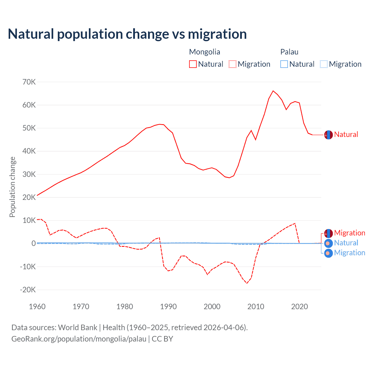 Over the last 10 years, 94.1% of the population change in Mongolia is from natural causes (a gain of 580,367 people) and 5.87% is from migration (a gain of 36,163 people). In Palau 53.8% is from natural causes (a gain of 264 people) and 46.2% is from migration (a loss of 227 people).