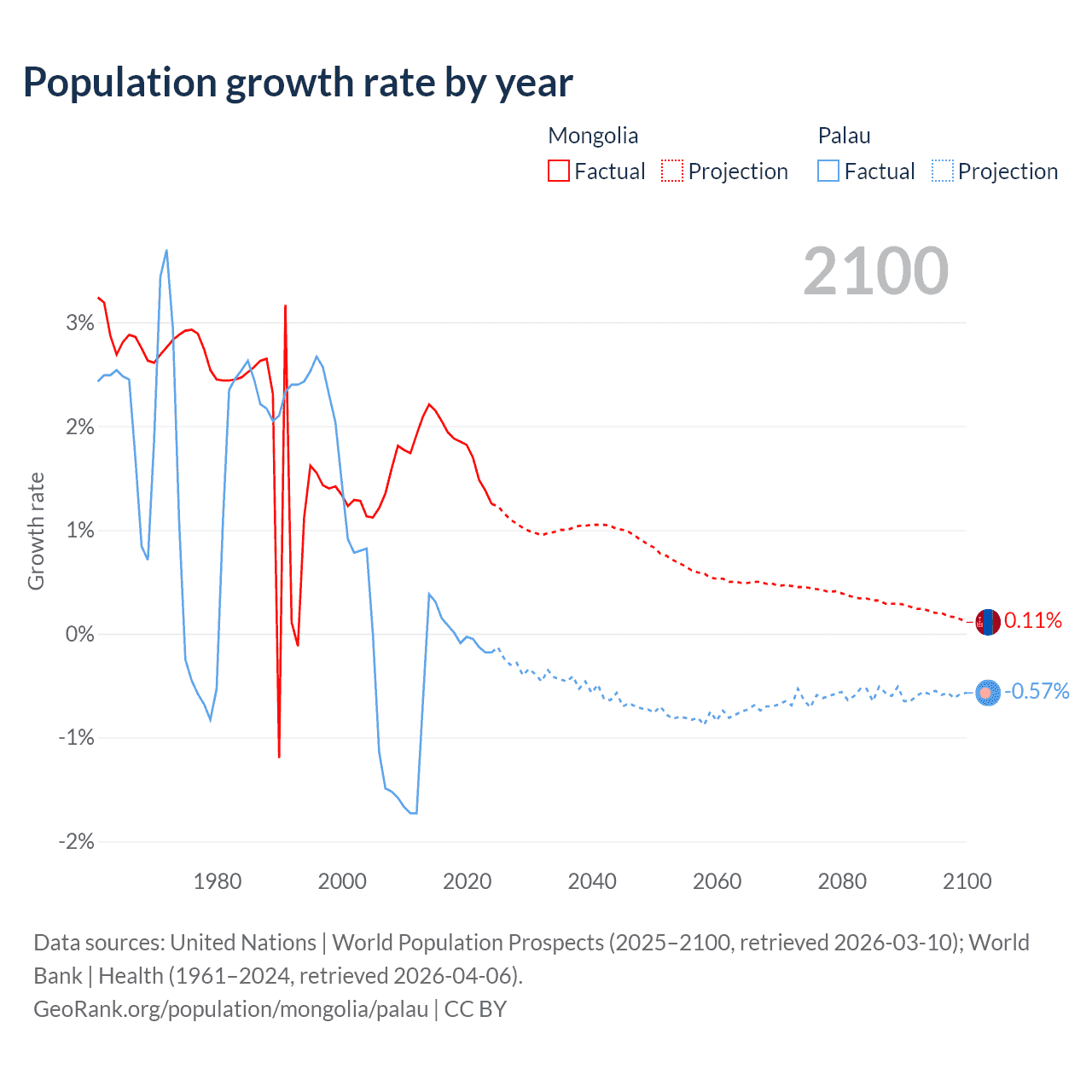 - For the last 10 years, Mongolia has had an average growth rate of +1.79% per year vs +0.02% in Palau.