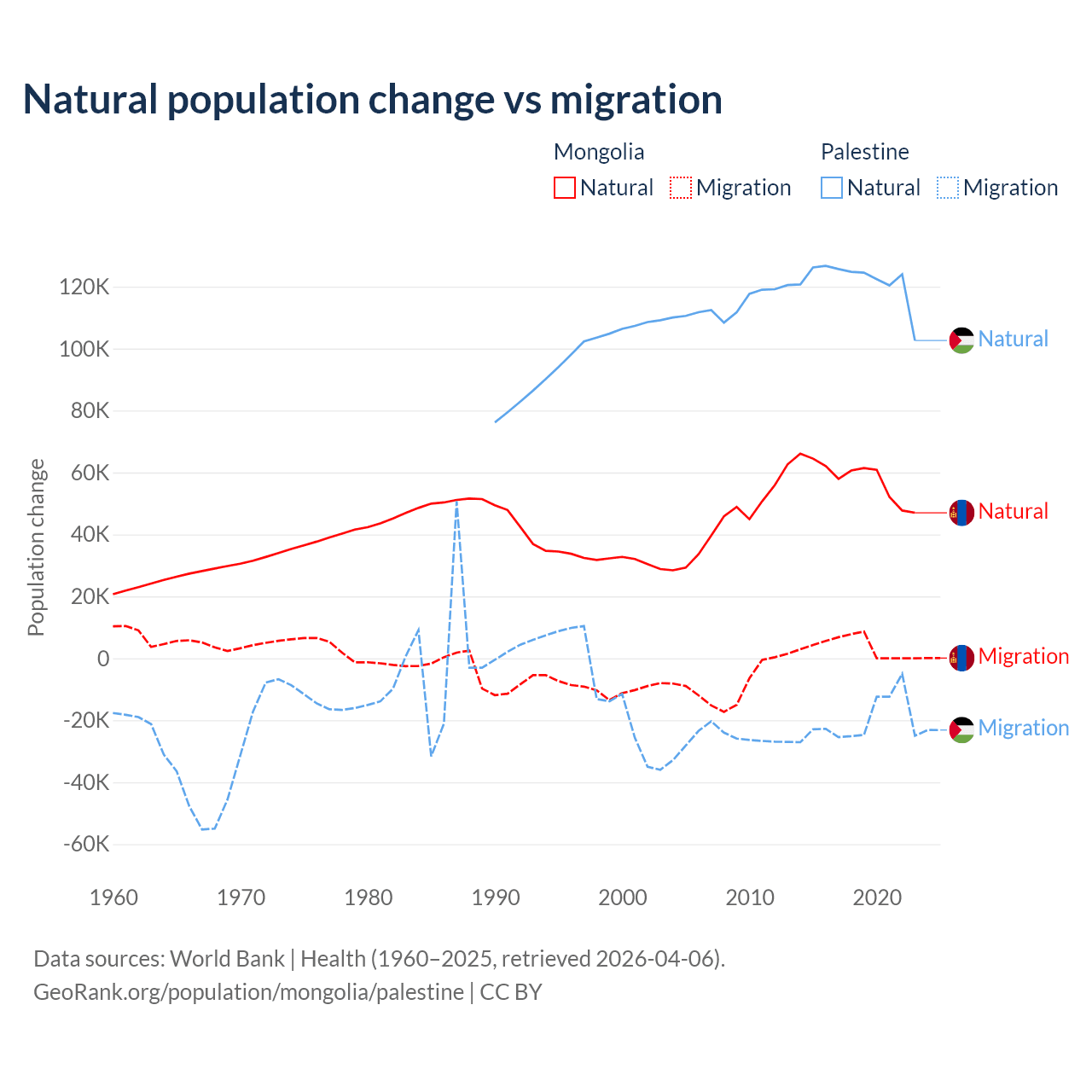 Over the last 10 years, 94.1% of the population change in Mongolia is from natural causes (a gain of 580,367 people) and 5.87% is from migration (a gain of 36,163 people). In Palestine 85.7% is from natural causes (a gain of 1,218,010 people) and 14.3% is from migration (a loss of 202,820 people).