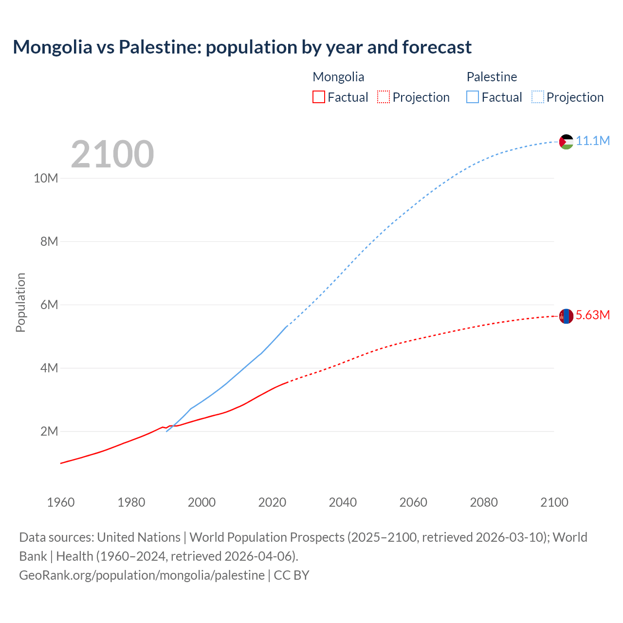 The latest officially reported population of Mongolia was 3,524,788 in 2024 vs 5,289,152 people in Palestine in 2024. In 2026, based on the adjusted UN estimation, the current Mongolia's population is 3,620,317 people compared to 5,500,288 in Palestine.