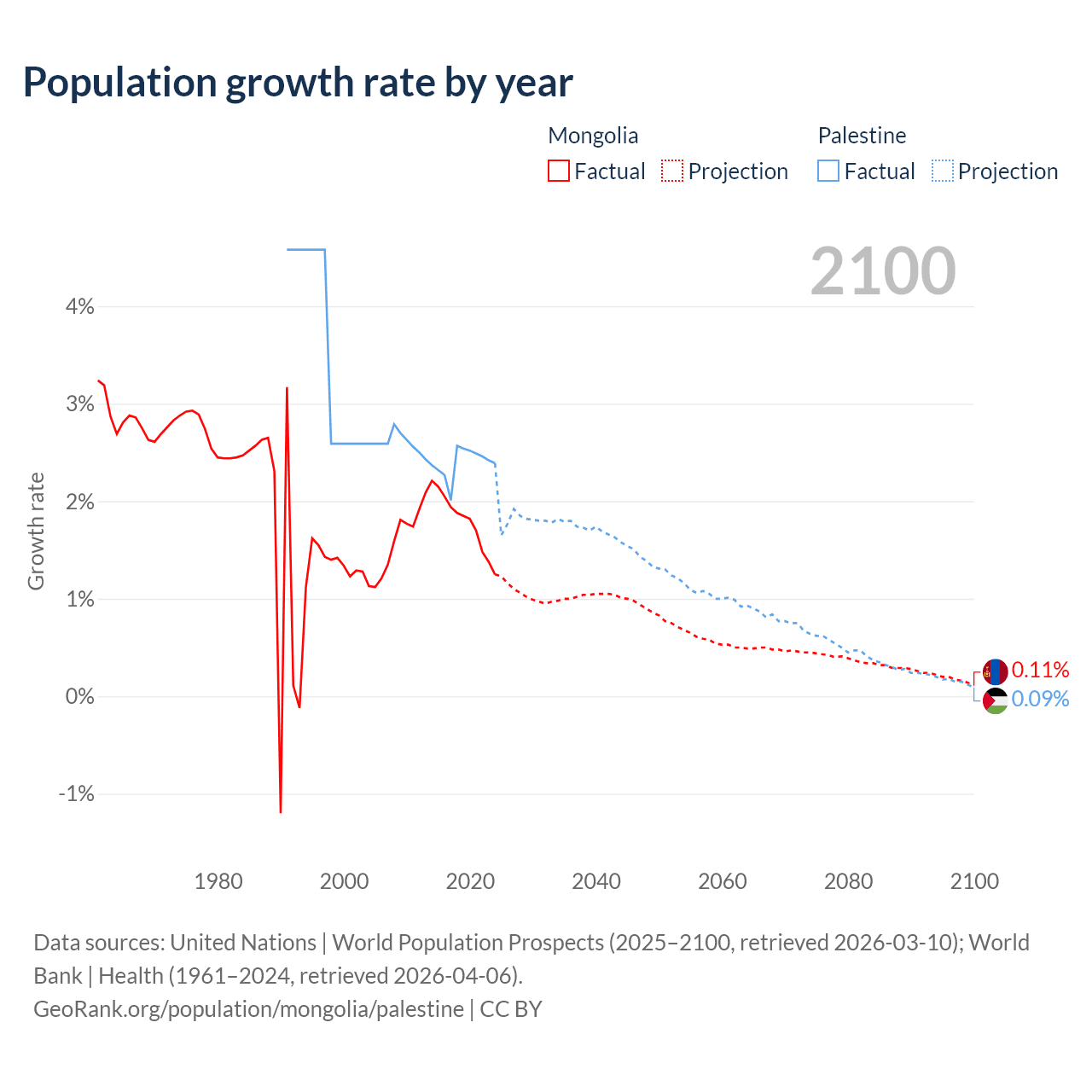 - For the last 10 years, Mongolia has had an average growth rate of +1.79% per year vs +2.4% in Palestine.
