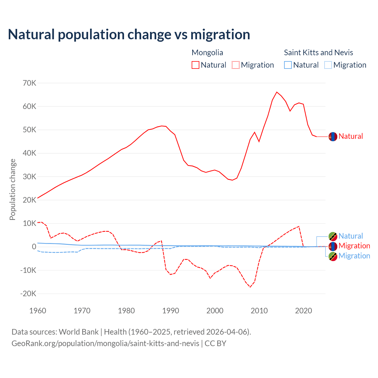 Over the last 10 years, 94.1% of the population change in Mongolia is from natural causes (a gain of 580,367 people) and 5.87% is from migration (a gain of 36,163 people). In Saint Kitts and Nevis 44.9% is from natural causes (a gain of 1,225 people) and 55.1% is from migration (a loss of 1,506 people).
