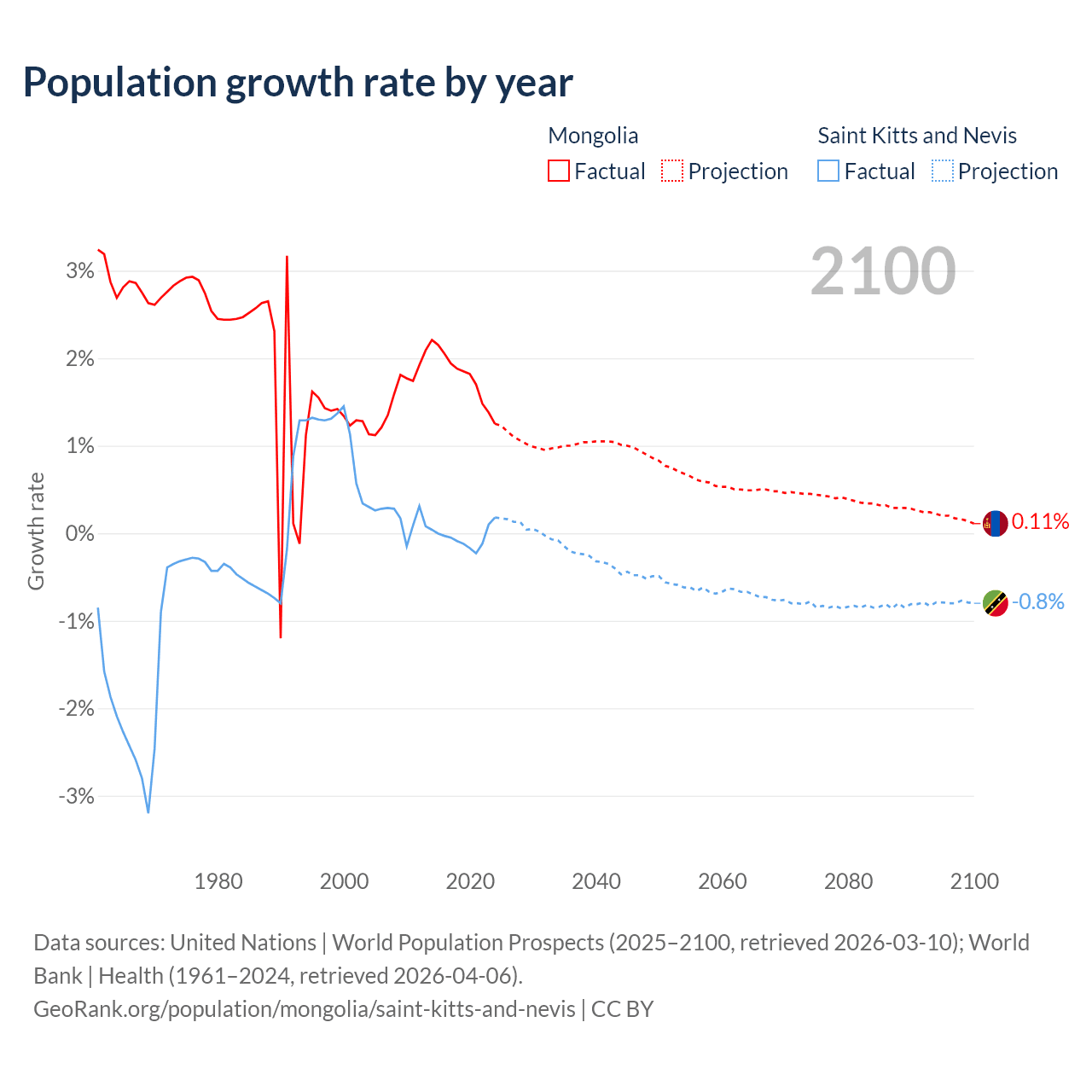 - For the last 10 years, Mongolia has had an average growth rate of +1.79% per year vs -0.04% in Saint Kitts and Nevis.