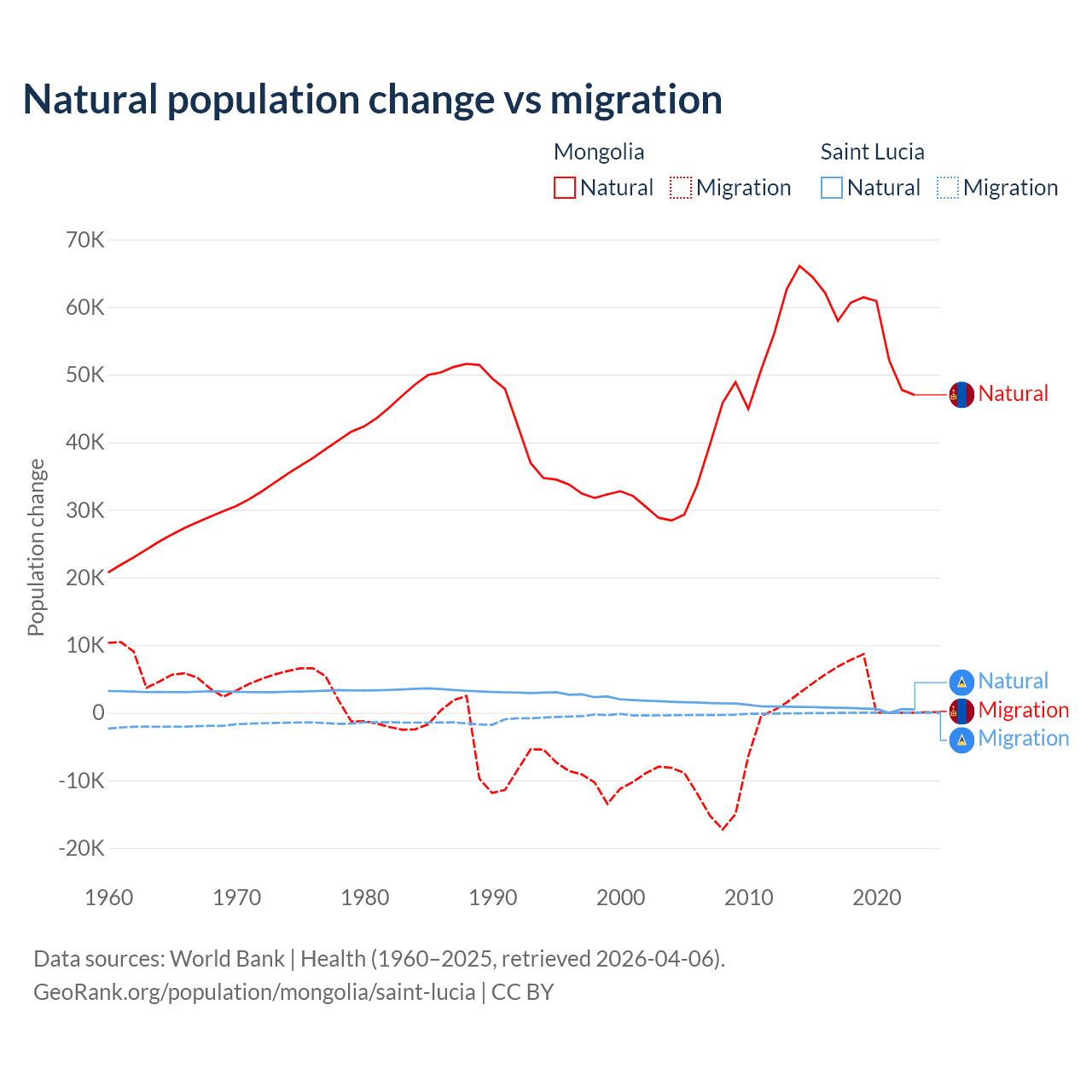 Over the last 10 years, 94.1% of the population change in Mongolia is from natural causes (a gain of 580,367 people) and 5.87% is from migration (a gain of 36,163 people). In Saint Lucia 95.7% is from natural causes (a gain of 6,039 people) and 4.31% is from migration (a loss of 272 people).
