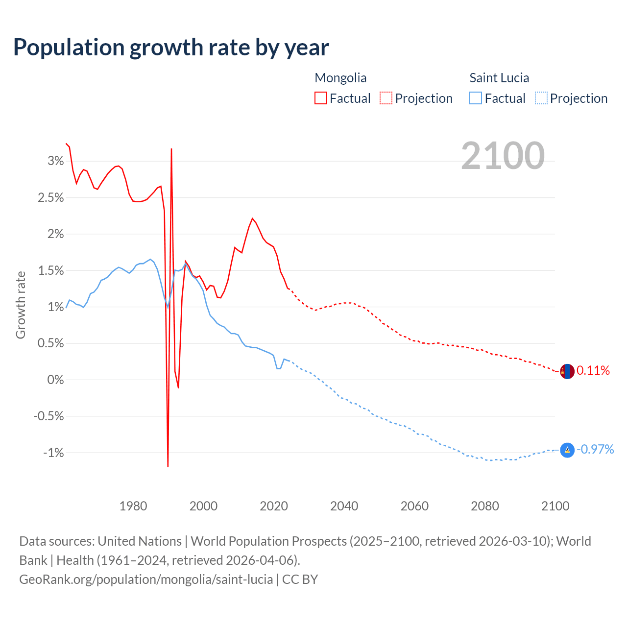 - For the last 10 years, Mongolia has had an average growth rate of +1.79% per year vs +0.33% in Saint Lucia.