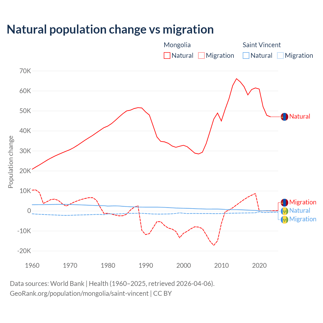 Over the last 10 years, 94.1% of the population change in Mongolia is from natural causes (a gain of 580,367 people) and 5.87% is from migration (a gain of 36,163 people). In Saint Vincent 21.2% is from natural causes (a gain of 2,525 people) and 78.8% is from migration (a loss of 9,393 people).