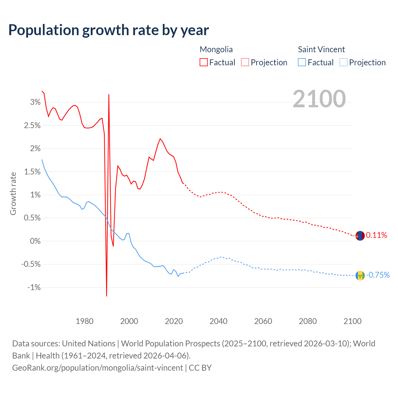- For the last 10 years, Mongolia has had an average growth rate of +1.79% per year vs -0.65% in Saint Vincent.