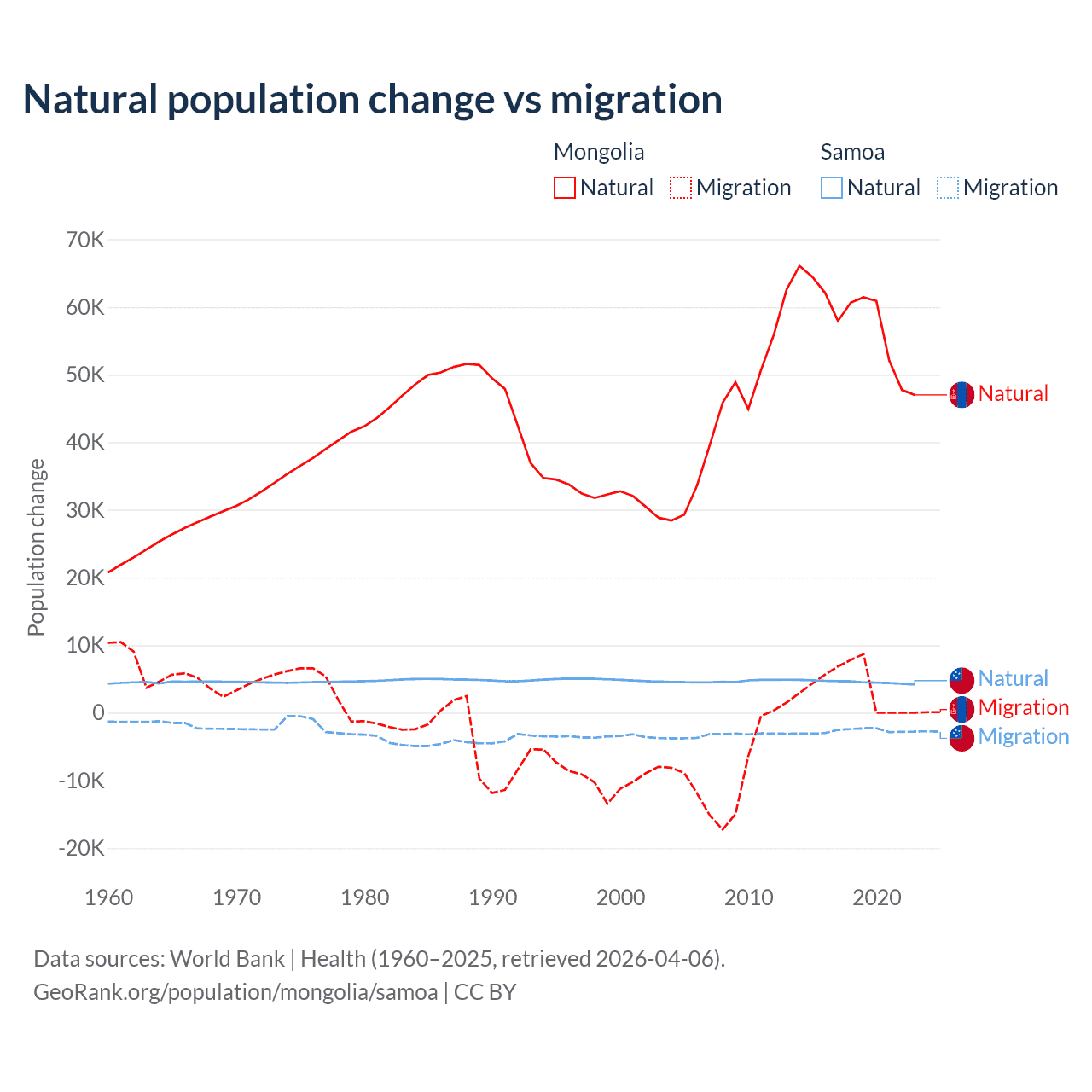 Over the last 10 years, 94.1% of the population change in Mongolia is from natural causes (a gain of 580,367 people) and 5.87% is from migration (a gain of 36,163 people). In Samoa 62.5% is from natural causes (a gain of 45,436 people) and 37.5% is from migration (a loss of 27,246 people).