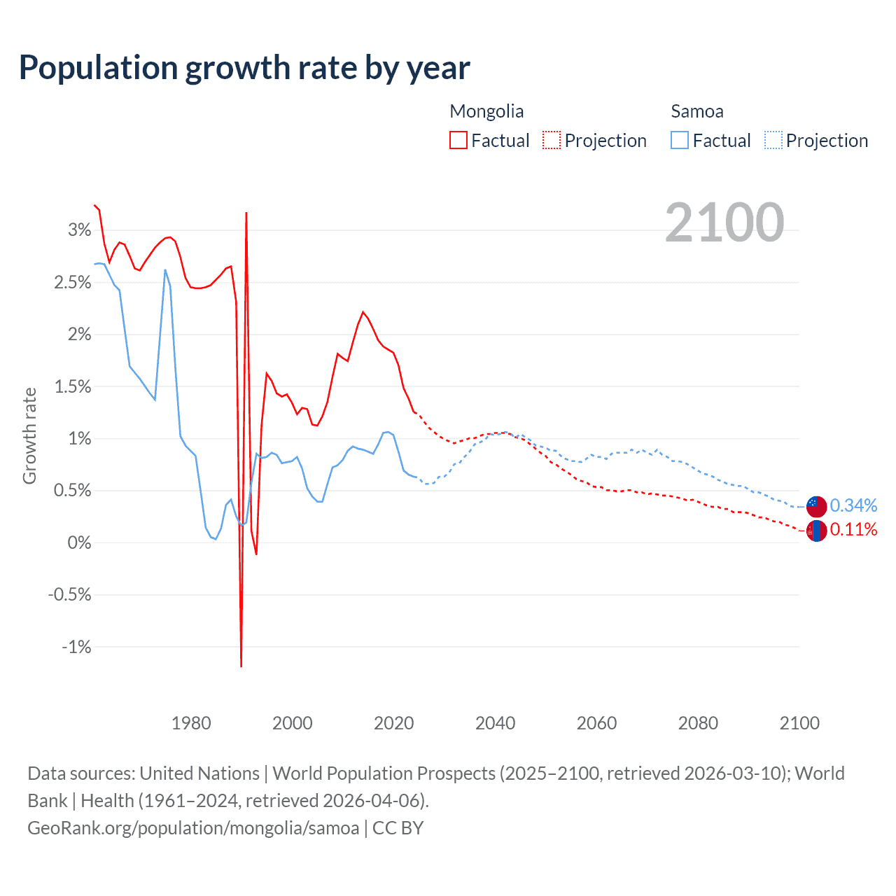 - For the last 10 years, Mongolia has had an average growth rate of +1.79% per year vs +0.87% in Samoa.