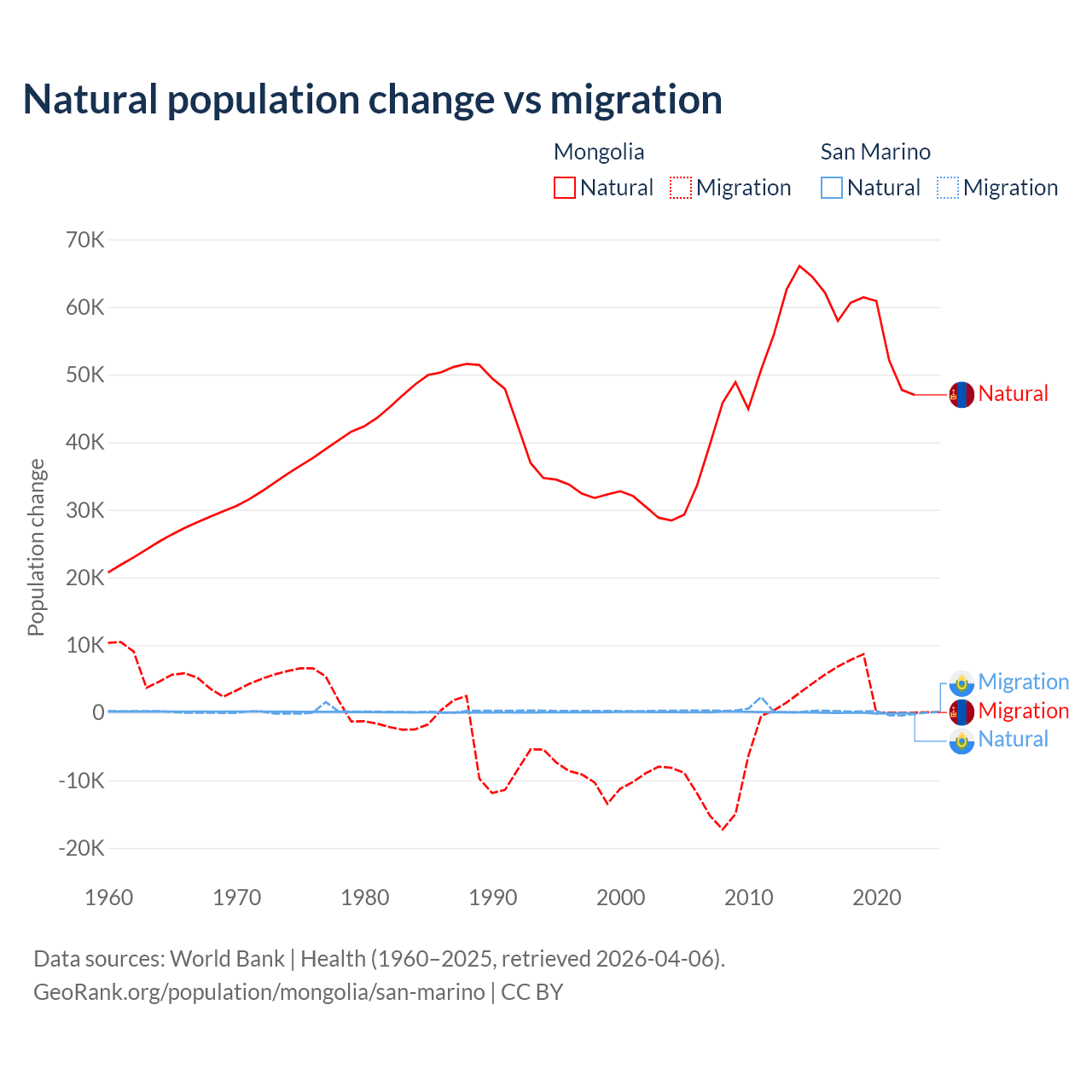 Over the last 10 years, 94.1% of the population change in Mongolia is from natural causes (a gain of 580,367 people) and 5.87% is from migration (a gain of 36,163 people). In San Marino 40.9% is from natural causes (a loss of 358 people) and 59.1% is from migration (a gain of 517 people).