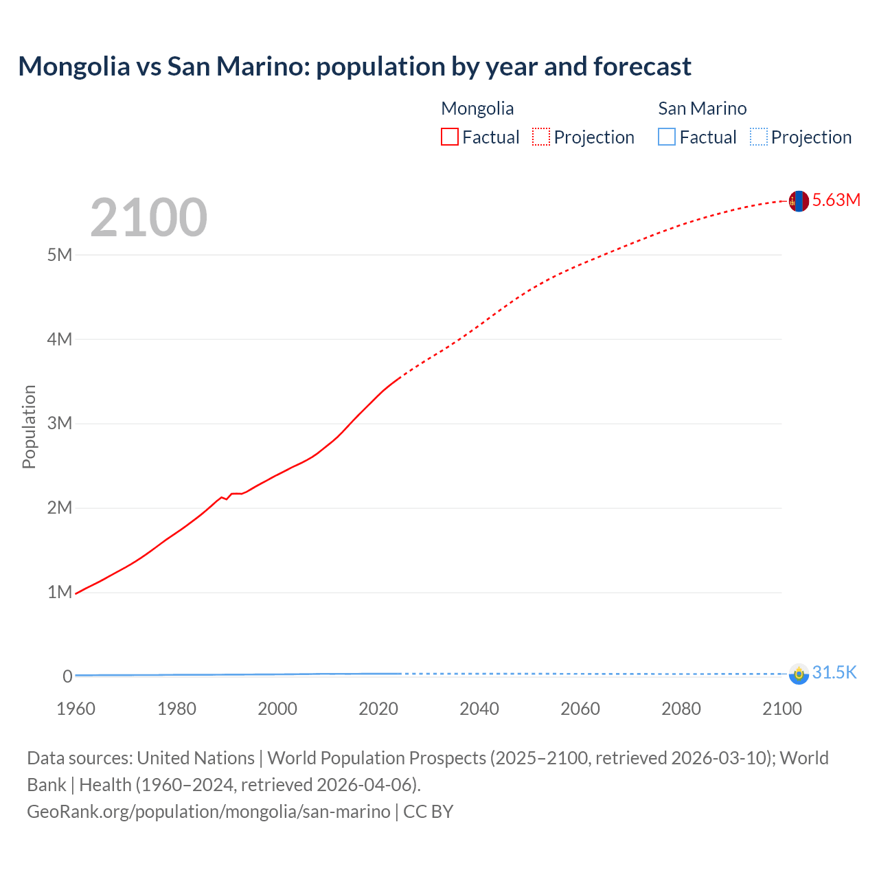 The latest officially reported population of Mongolia was 3,524,788 in 2024 vs 33,977 people in San Marino in 2024. In 2026, based on the adjusted UN estimation, the current Mongolia's population is 3,620,317 people compared to 33,967 in San Marino.