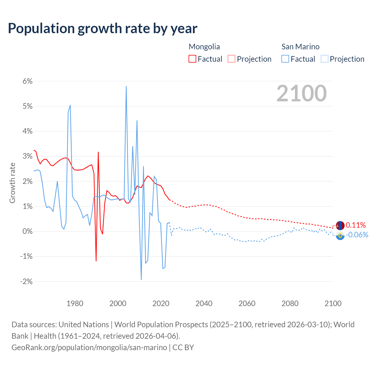 - For the last 10 years, Mongolia has had an average growth rate of +1.79% per year vs +0.26% in San Marino.