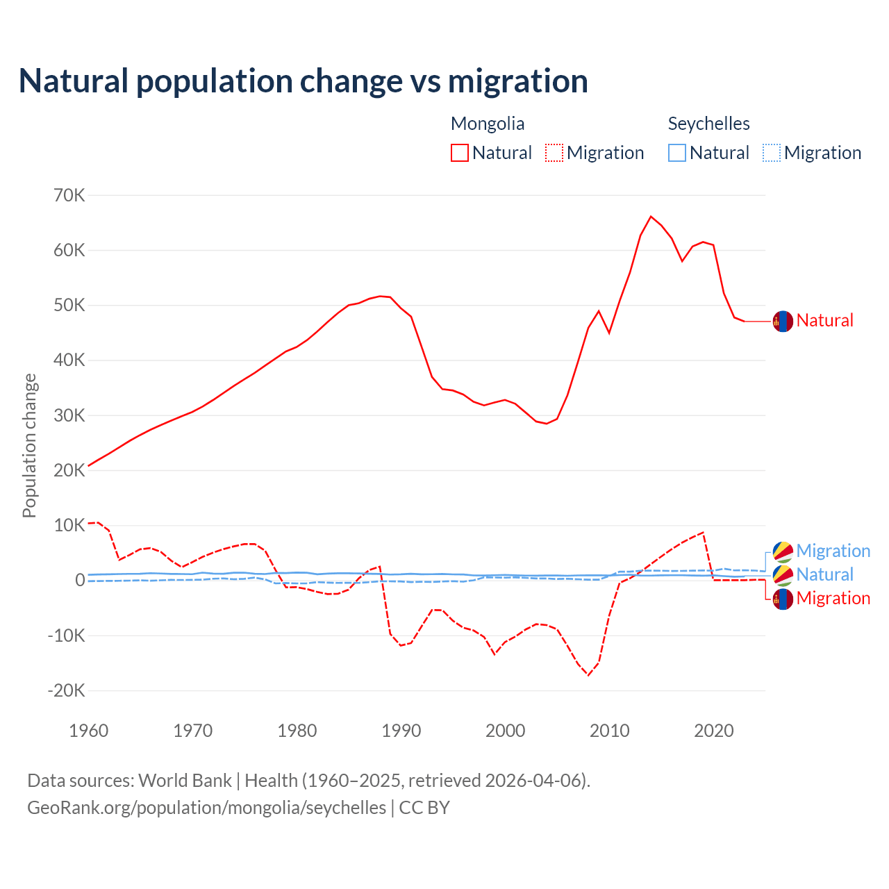 Over the last 10 years, 94.1% of the population change in Mongolia is from natural causes (a gain of 580,367 people) and 5.87% is from migration (a gain of 36,163 people). In the Seychelles 31.4% is from natural causes (a gain of 8,122 people) and 68.6% is from migration (a gain of 17,748 people).