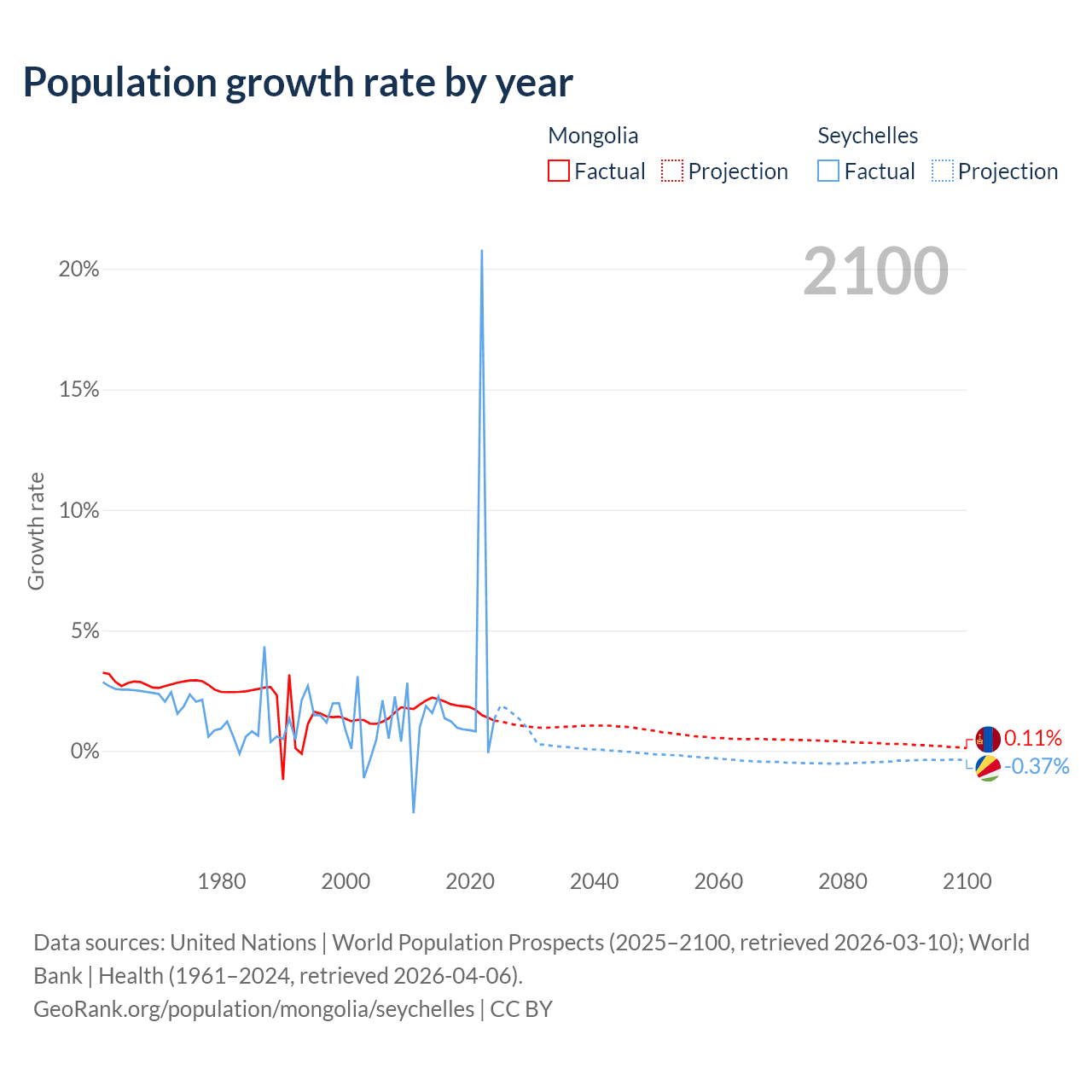 - For the last 10 years, Mongolia has had an average growth rate of +1.79% per year vs +2.9% in the Seychelles.