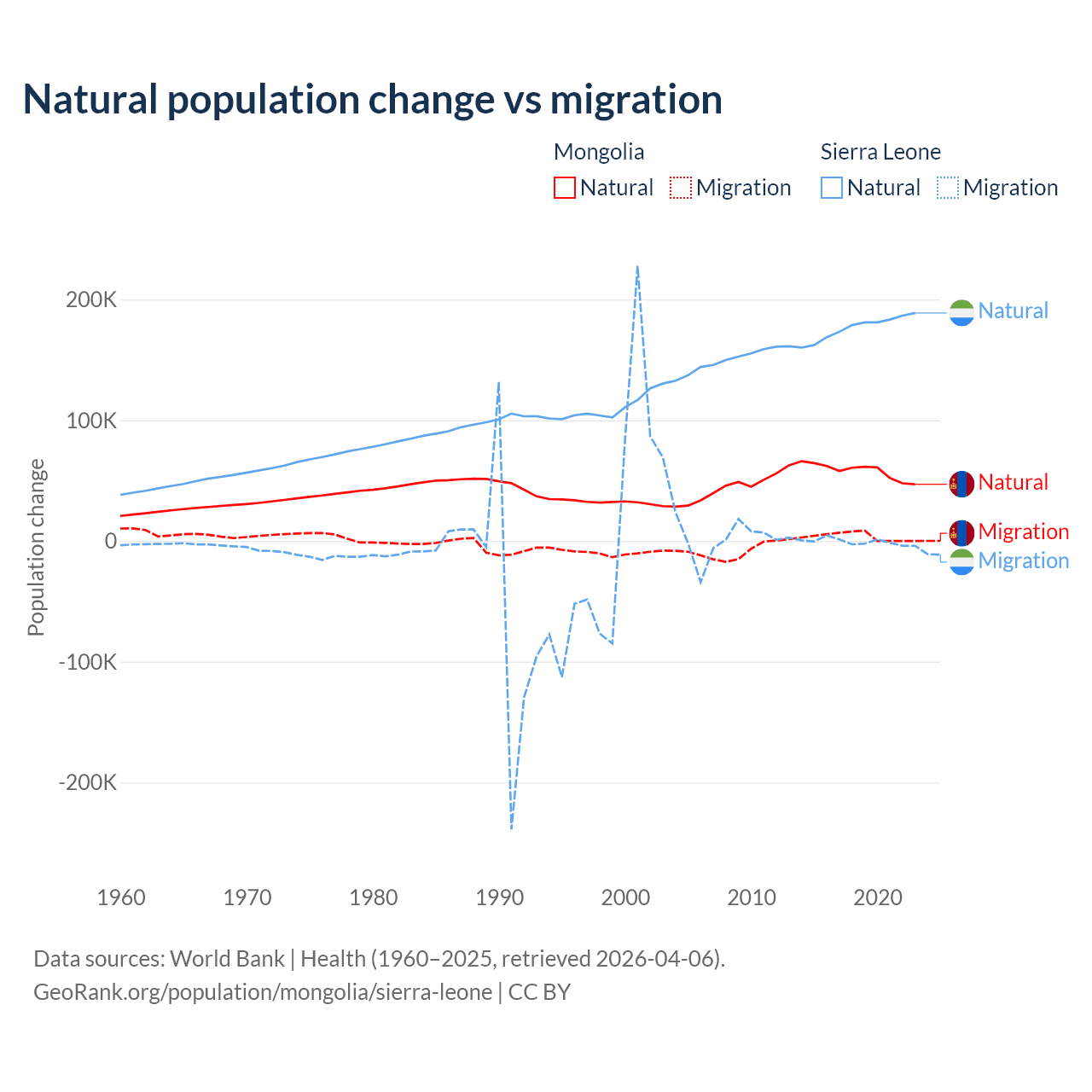 Over the last 10 years, 94.1% of the population change in Mongolia is from natural causes (a gain of 580,367 people) and 5.87% is from migration (a gain of 36,163 people). In Sierra Leone 99.6% is from natural causes (a gain of 1,764,049 people) and 0.41% is from migration (a loss of 7,211 people).