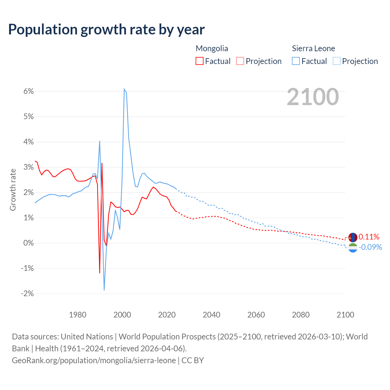 - For the last 10 years, Mongolia has had an average growth rate of +1.79% per year vs +2.32% in Sierra Leone.