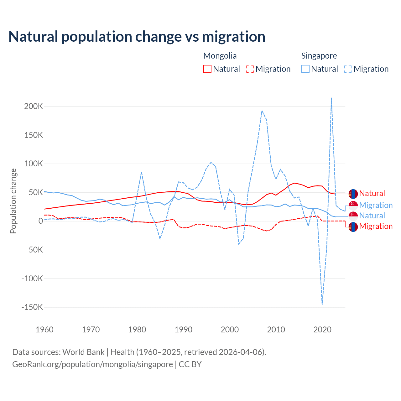 Over the last 10 years, 94.1% of the population change in Mongolia is from natural causes (a gain of 580,367 people) and 5.87% is from migration (a gain of 36,163 people). In Singapore 54.8% is from natural causes (a gain of 195,953 people) and 45.2% is from migration (a gain of 161,805 people).