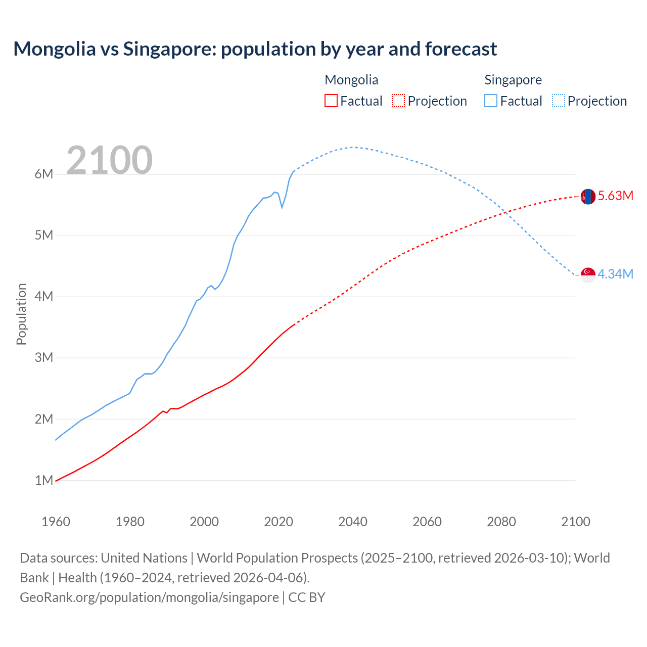 The latest officially reported population of Mongolia was 3,524,788 in 2024 vs 6,036,860 people in Singapore in 2024. In 2026, based on the adjusted UN estimation, the current Mongolia's population is 3,620,317 people compared to 6,125,852 in Singapore.