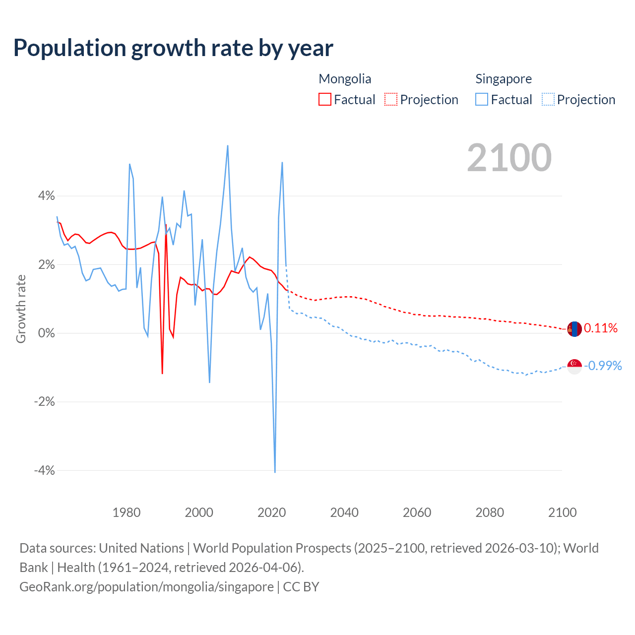 - For the last 10 years, Mongolia has had an average growth rate of +1.79% per year vs +1.04% in Singapore.