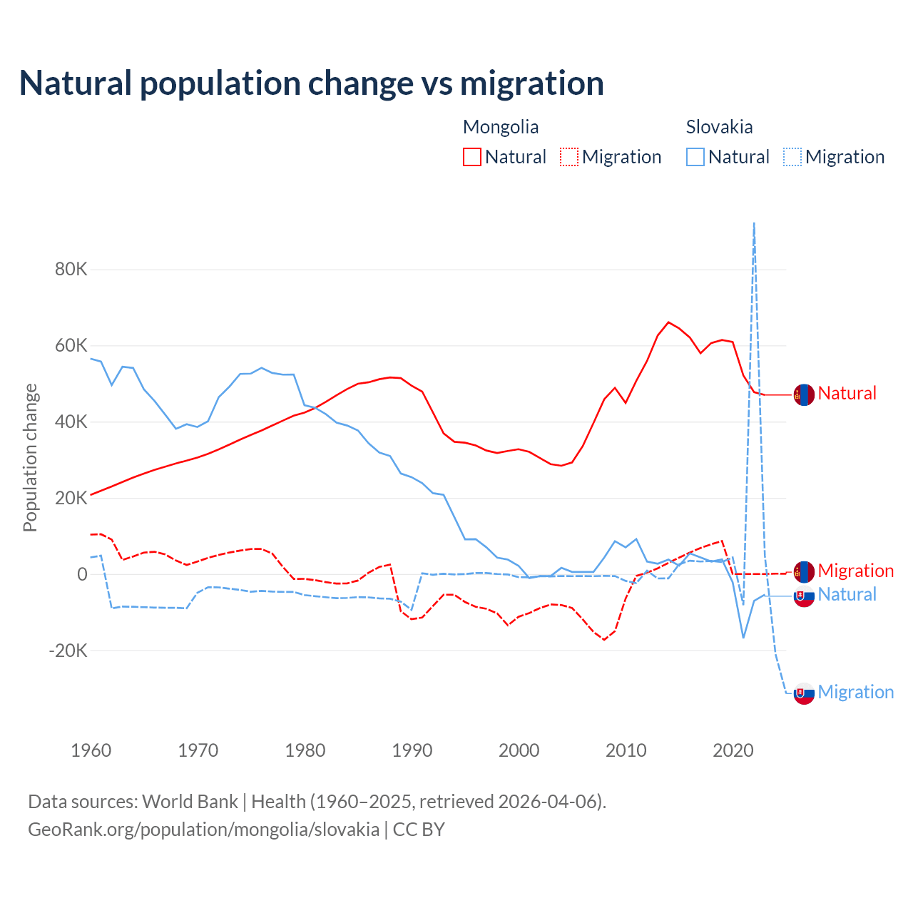 Over the last 10 years, 94.1% of the population change in Mongolia is from natural causes (a gain of 580,367 people) and 5.87% is from migration (a gain of 36,163 people). In Slovakia 7.47% is from natural causes (a loss of 8,728 people) and 92.5% is from migration (a gain of 108,156 people).