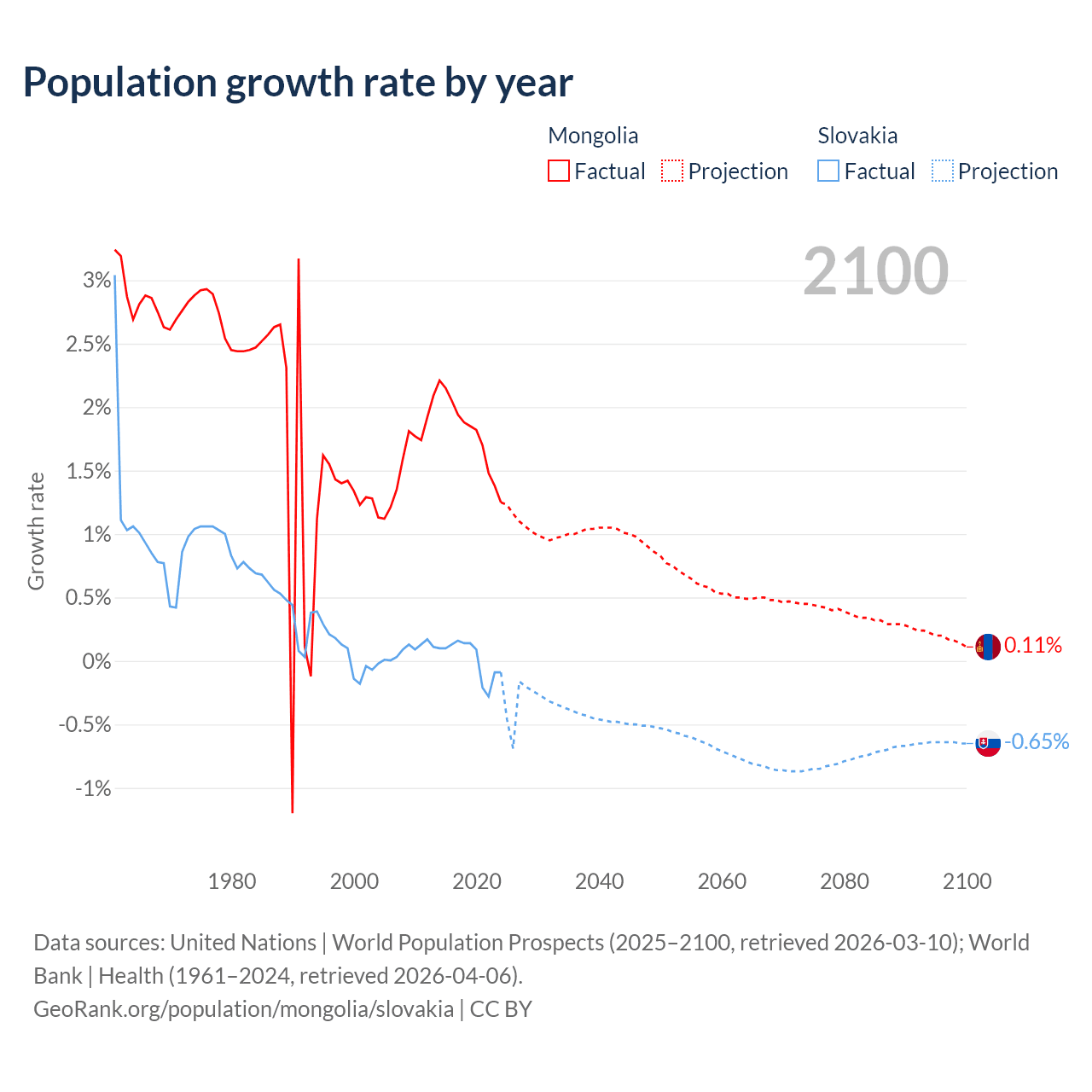 - For the last 10 years, Mongolia has had an average growth rate of +1.79% per year vs +0.01% in Slovakia.