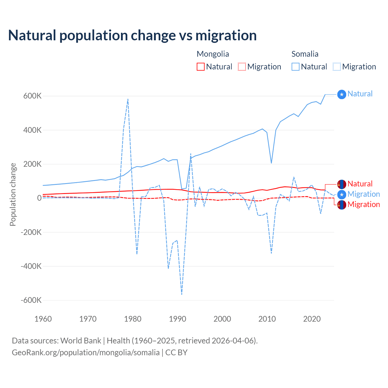 Over the last 10 years, 94.1% of the population change in Mongolia is from natural causes (a gain of 580,367 people) and 5.87% is from migration (a gain of 36,163 people). In Somalia 94.4% is from natural causes (a gain of 5,270,105 people) and 5.58% is from migration (a gain of 311,487 people).