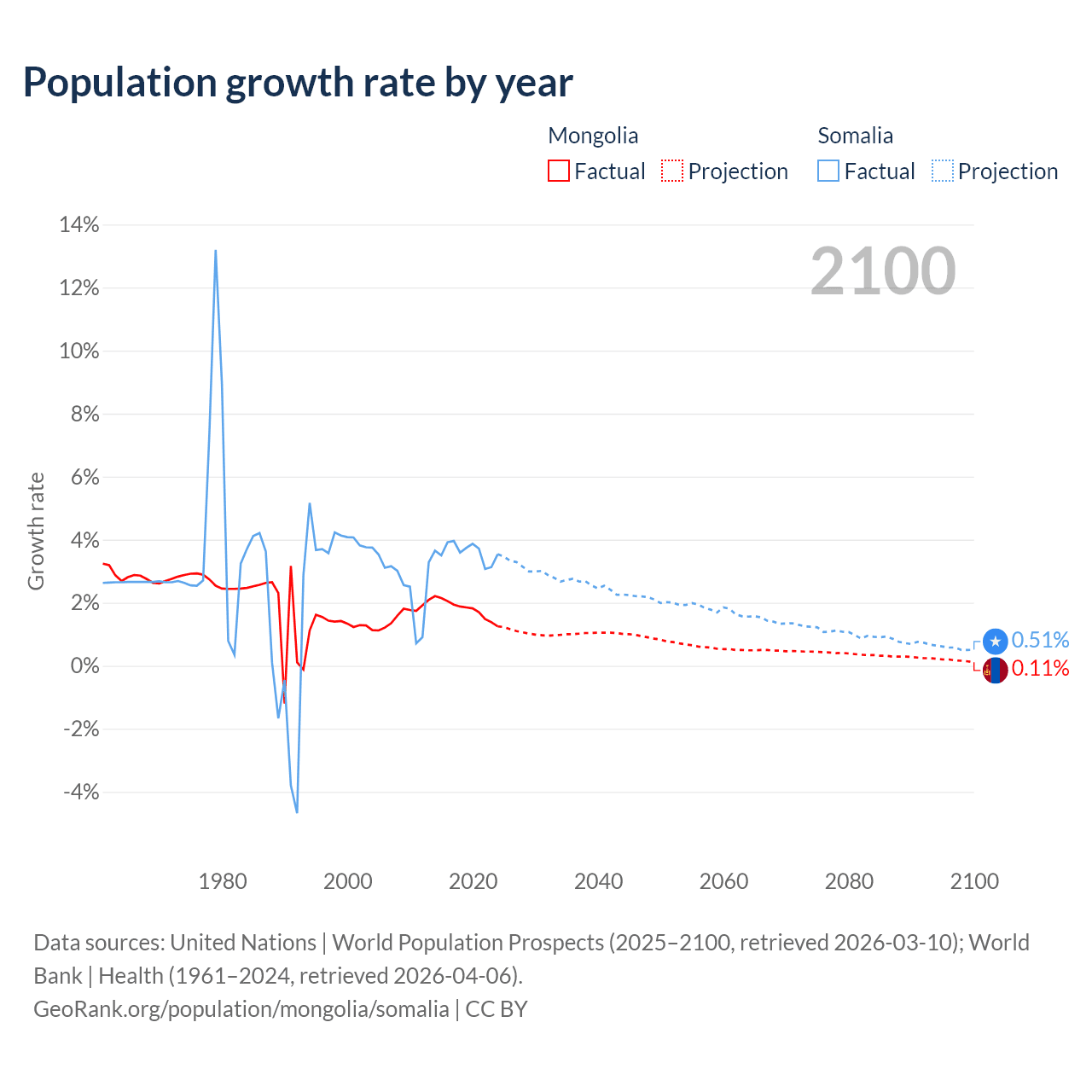 - For the last 10 years, Mongolia has had an average growth rate of +1.79% per year vs +3.61% in Somalia.