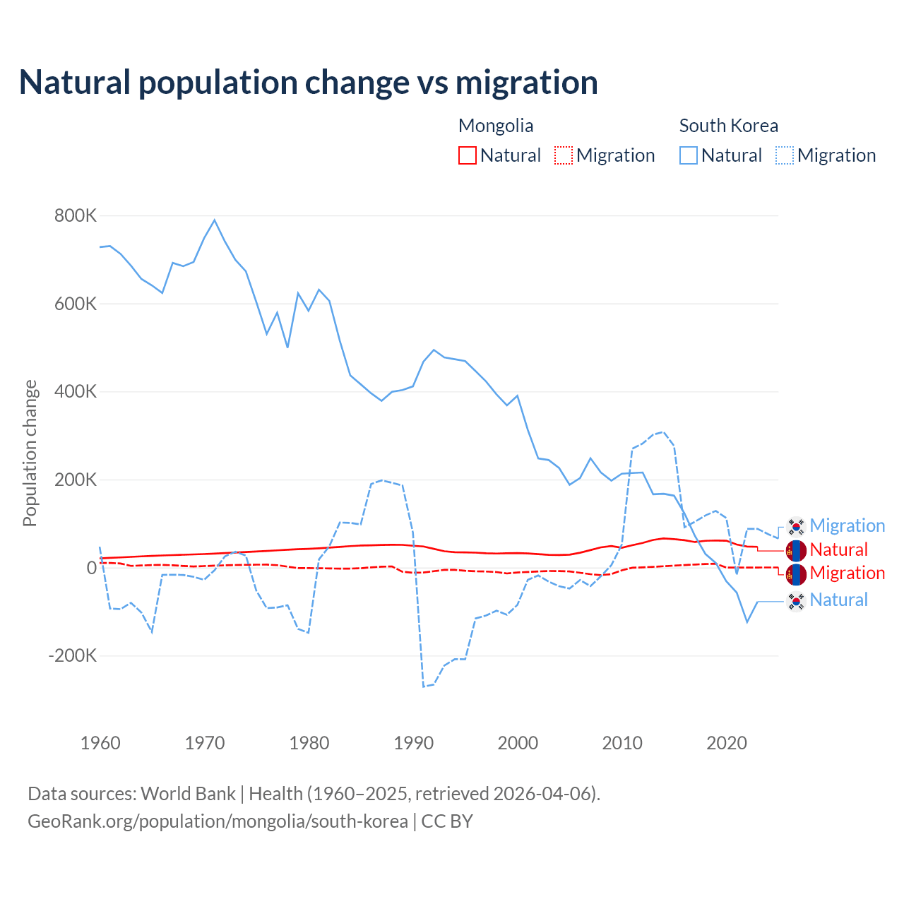 Over the last 10 years, 94.1% of the population change in Mongolia is from natural causes (a gain of 580,367 people) and 5.87% is from migration (a gain of 36,163 people). In South Korea 17.6% is from natural causes (a gain of 277,215 people) and 82.4% is from migration (a gain of 1,298,356 people).