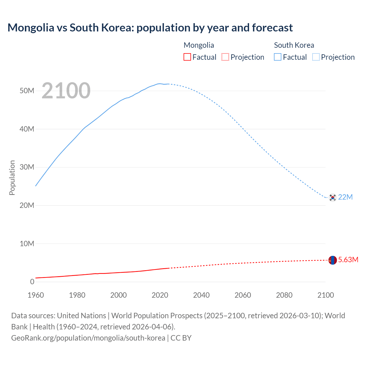 Mongolia vs South Korea: population by year and forecast