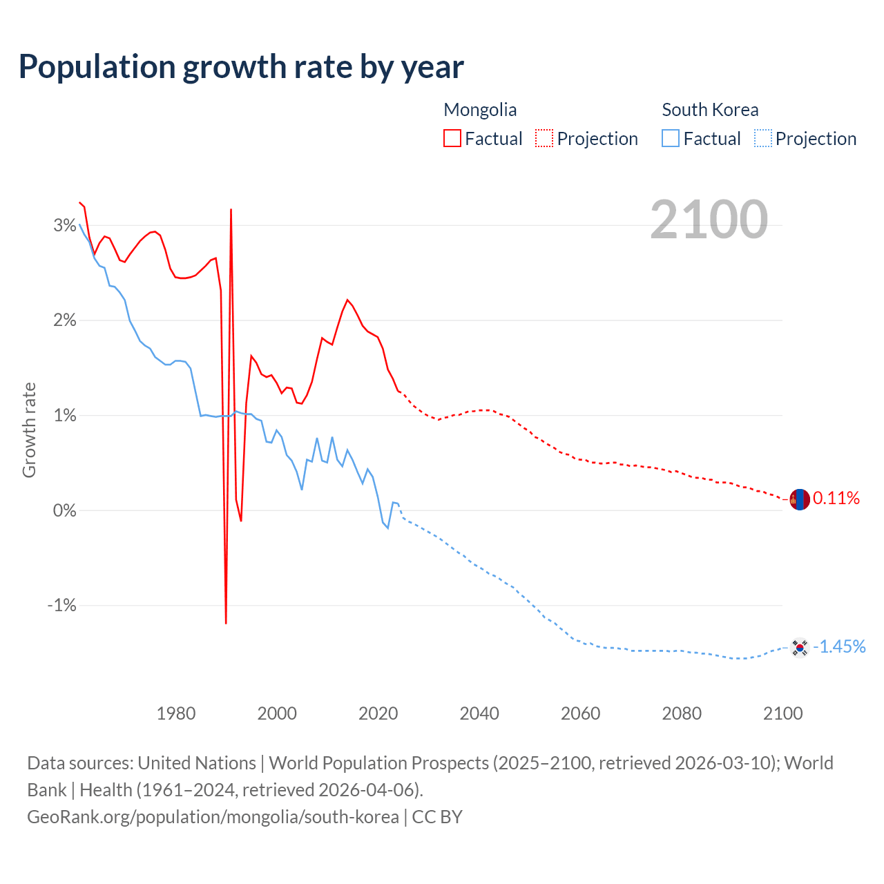 - For the last 10 years, Mongolia has had an average growth rate of +1.79% per year vs +0.24% in South Korea.