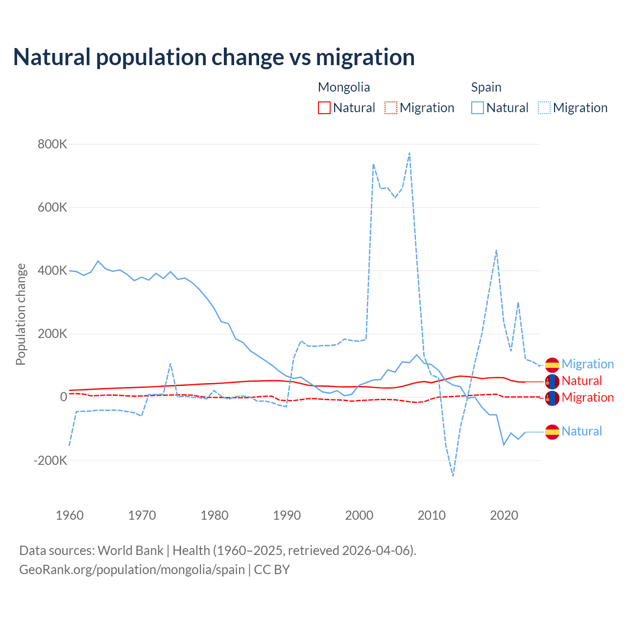 Over the last 10 years, 94.1% of the population change in Mongolia is from natural causes (a gain of 580,367 people) and 5.87% is from migration (a gain of 36,163 people). In Spain 25.8% is from natural causes (a loss of 627,829 people) and 74.2% is from migration (a gain of 1,810,127 people).
