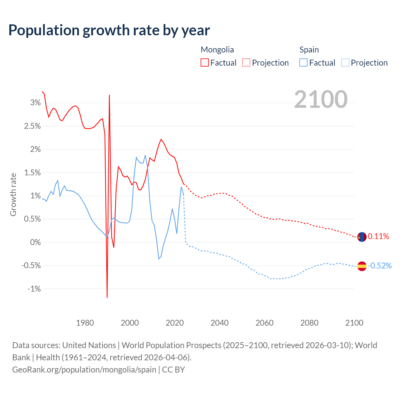- For the last 10 years, Mongolia has had an average growth rate of +1.79% per year vs +0.43% in Spain.