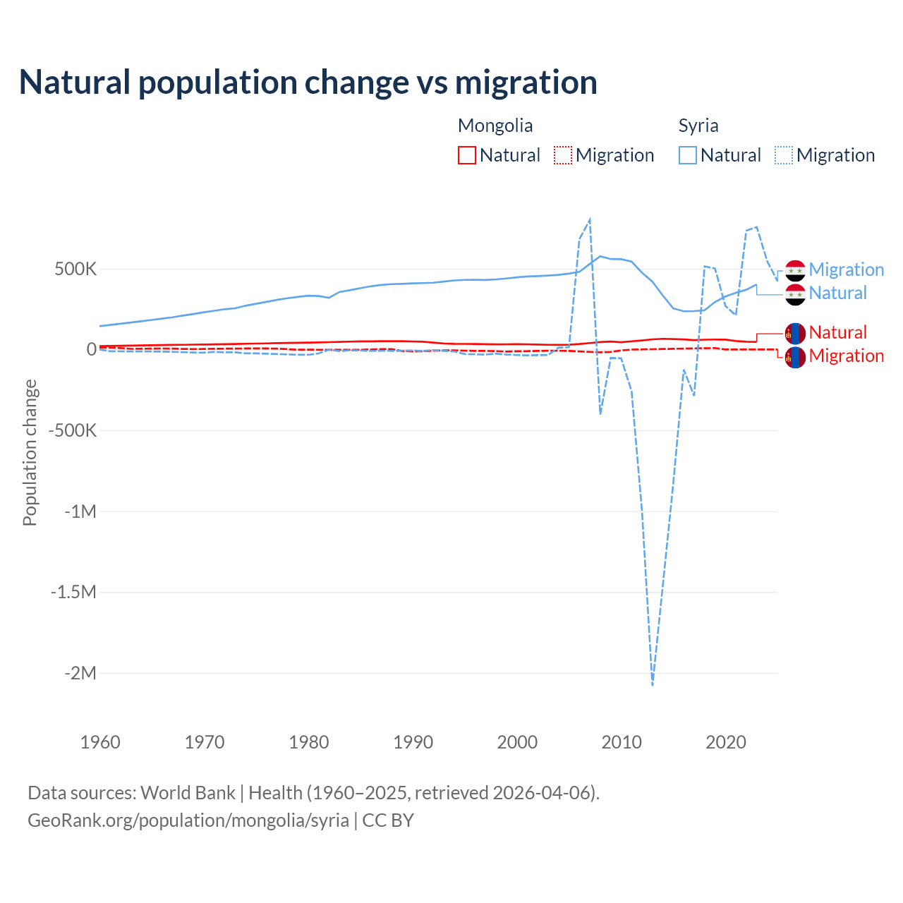 Over the last 10 years, 94.1% of the population change in Mongolia is from natural causes (a gain of 580,367 people) and 5.87% is from migration (a gain of 36,163 people). In Syria 91.3% is from natural causes (a gain of 3,047,621 people) and 8.72% is from migration (a gain of 291,069 people).