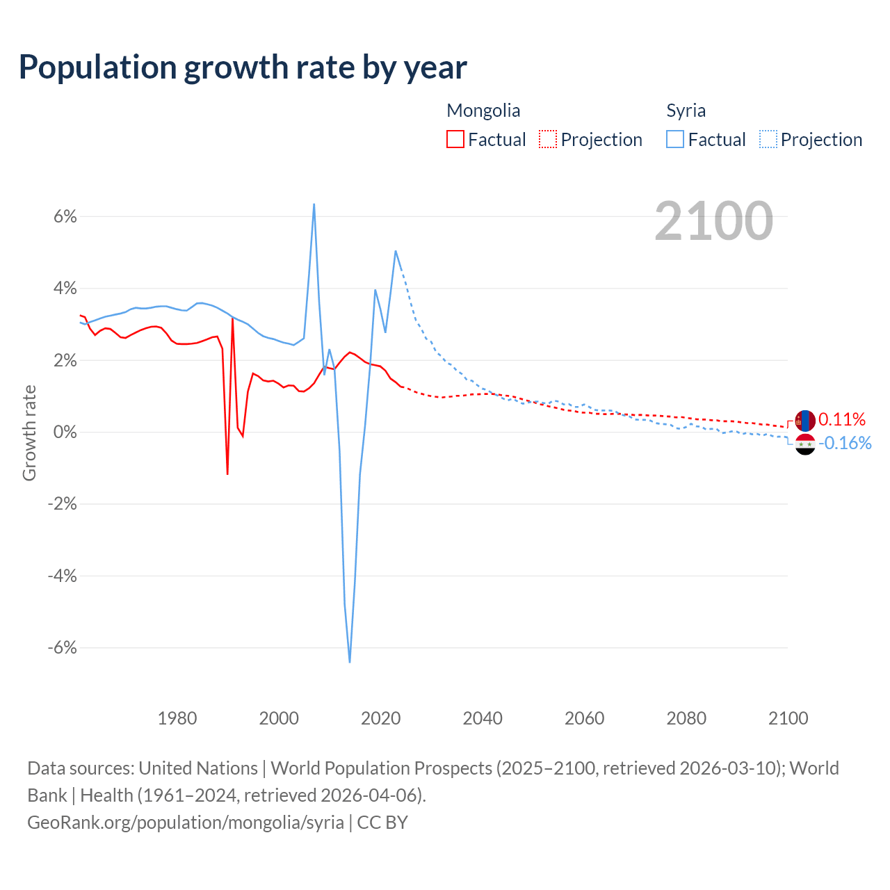 - For the last 10 years, Mongolia has had an average growth rate of +1.79% per year vs +1.25% in Syria.