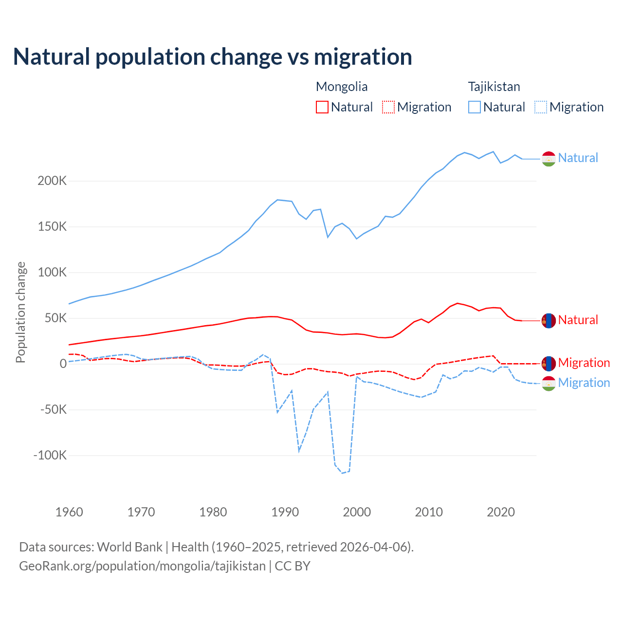 Over the last 10 years, 94.1% of the population change in Mongolia is from natural causes (a gain of 580,367 people) and 5.87% is from migration (a gain of 36,163 people). In Tajikistan 96% is from natural causes (a gain of 2,266,045 people) and 3.95% is from migration (a loss of 93,205 people).
