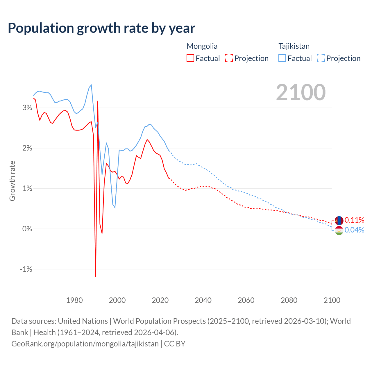 - For the last 10 years, Mongolia has had an average growth rate of +1.79% per year vs +2.33% in Tajikistan.