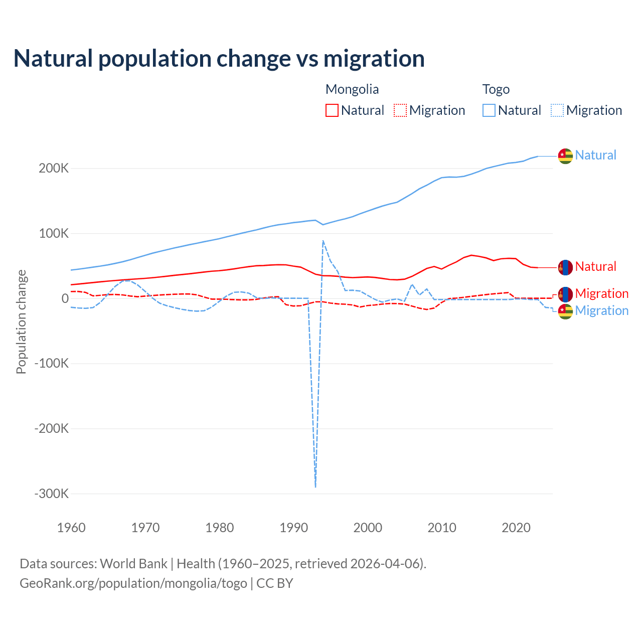 Over the last 10 years, 94.1% of the population change in Mongolia is from natural causes (a gain of 580,367 people) and 5.87% is from migration (a gain of 36,163 people). In Togo 99.1% is from natural causes (a gain of 2,052,115 people) and 0.86% is from migration (a loss of 17,852 people).