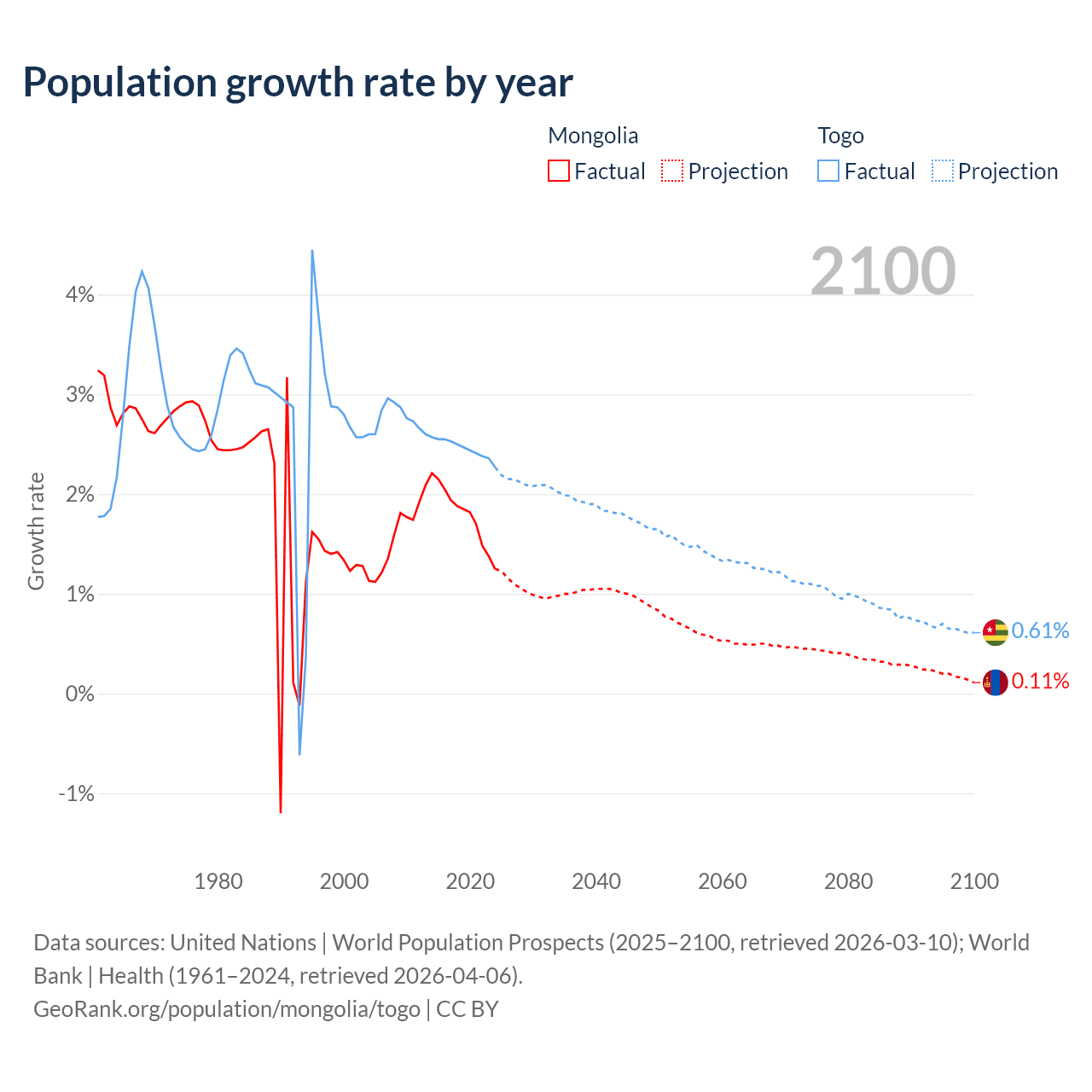 - For the last 10 years, Mongolia has had an average growth rate of +1.79% per year vs +2.46% in Togo.