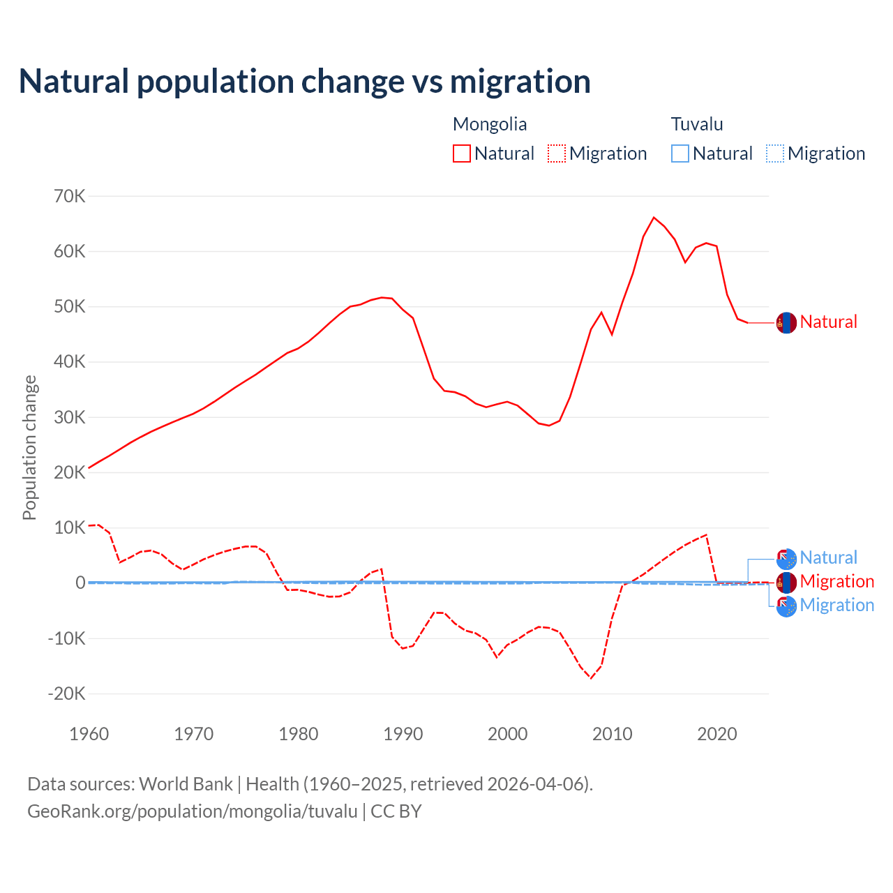 Over the last 10 years, 94.1% of the population change in Mongolia is from natural causes (a gain of 580,367 people) and 5.87% is from migration (a gain of 36,163 people). In Tuvalu 35.5% is from natural causes (a gain of 1,556 people) and 64.5% is from migration (a loss of 2,827 people).