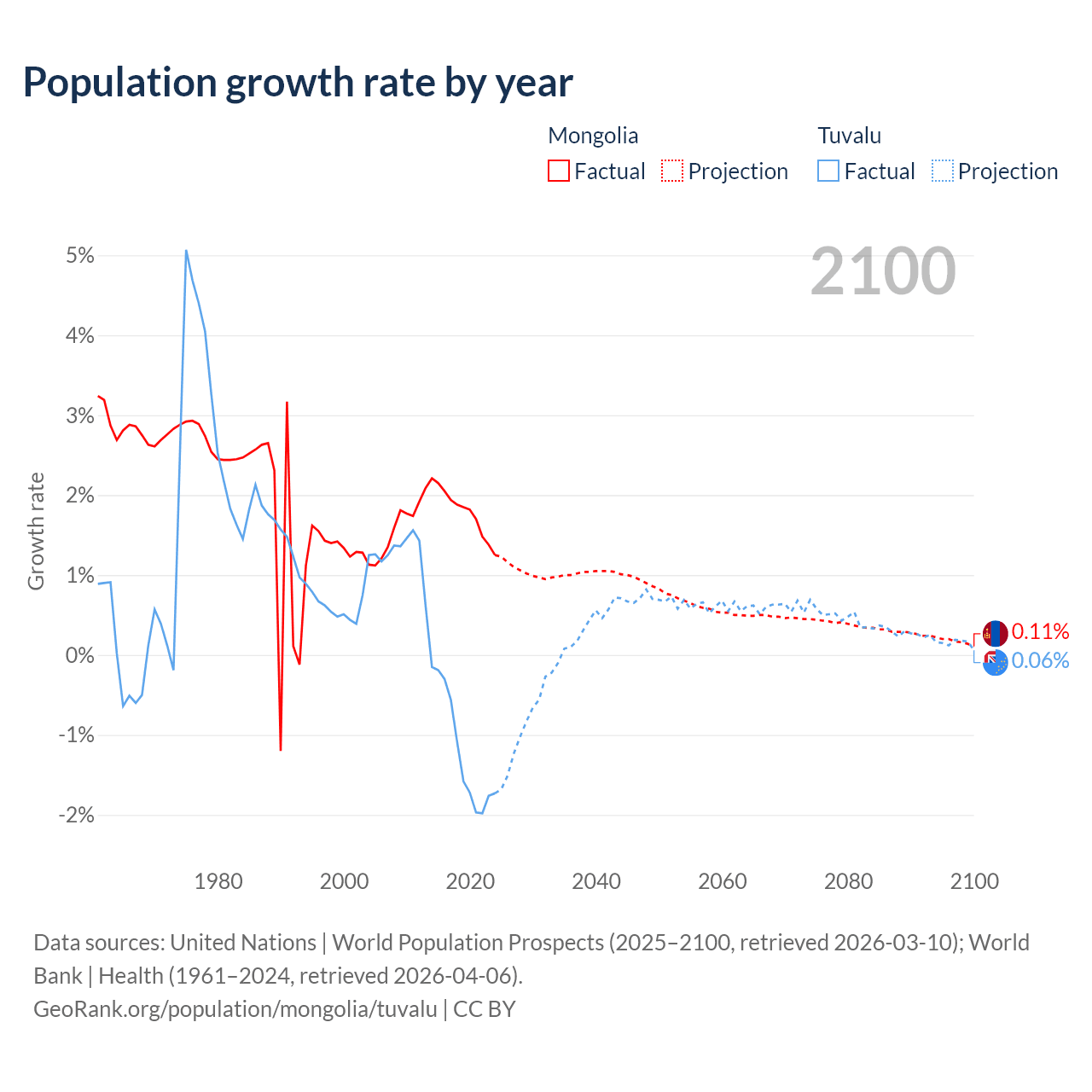 - For the last 10 years, Mongolia has had an average growth rate of +1.79% per year vs -1.19% in Tuvalu.