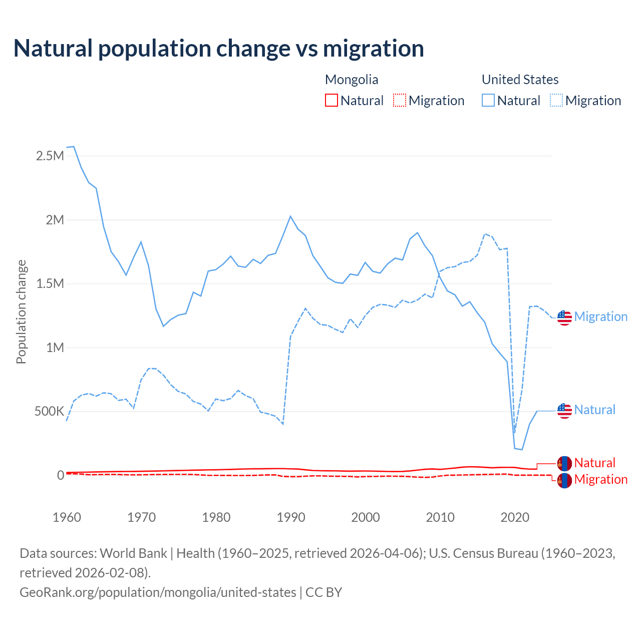 Over the last 10 years, 94.1% of the population change in Mongolia is from natural causes (a gain of 580,367 people) and 5.87% is from migration (a gain of 36,163 people). In the United States 35.8% is from natural causes (a gain of 8,005,866 people) and 64.2% is from migration (a gain of 14,334,286 people).