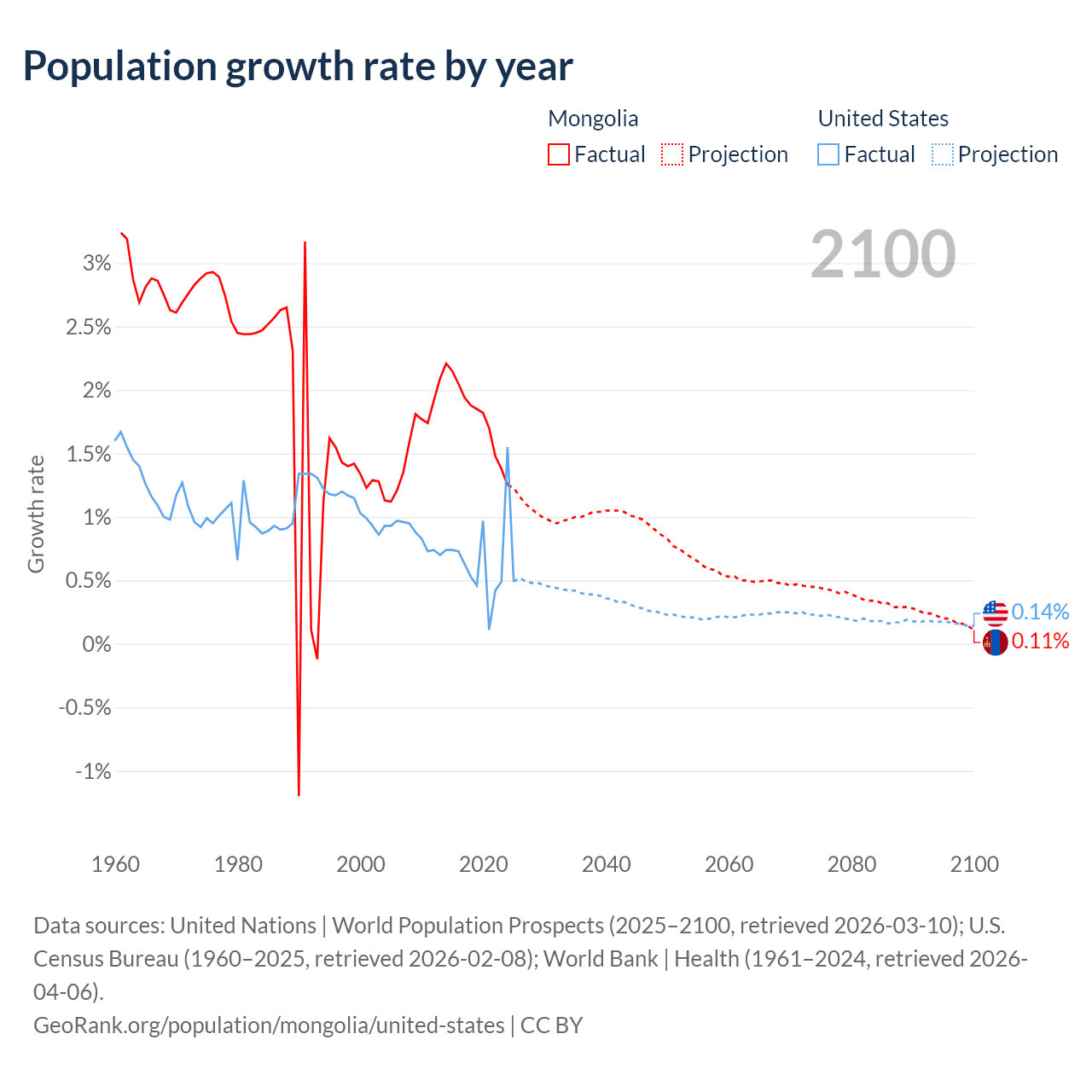 - For the last 10 years, Mongolia has had an average growth rate of +1.79% per year vs +0.65% in the United States.