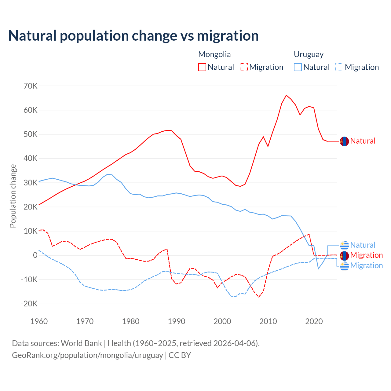 Over the last 10 years, 94.1% of the population change in Mongolia is from natural causes (a gain of 580,367 people) and 5.87% is from migration (a gain of 36,163 people). In Uruguay 70% is from natural causes (a gain of 64,303 people) and 30% is from migration (a loss of 27,501 people).