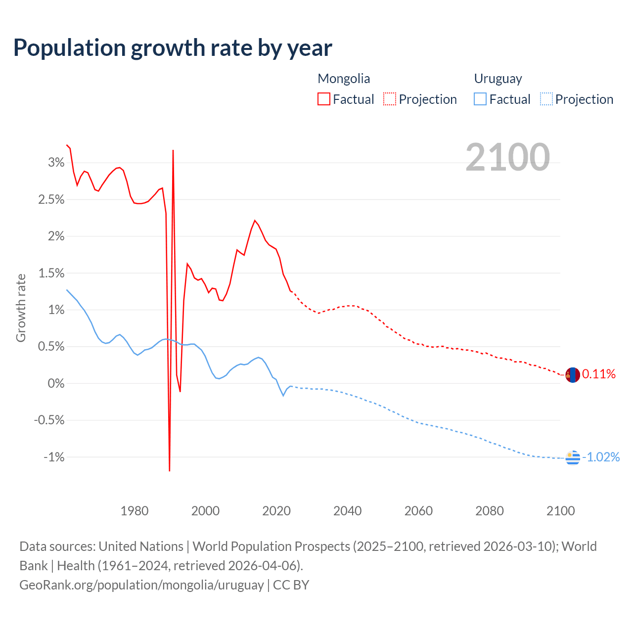 - For the last 10 years, Mongolia has had an average growth rate of +1.79% per year vs +0.11% in Uruguay.