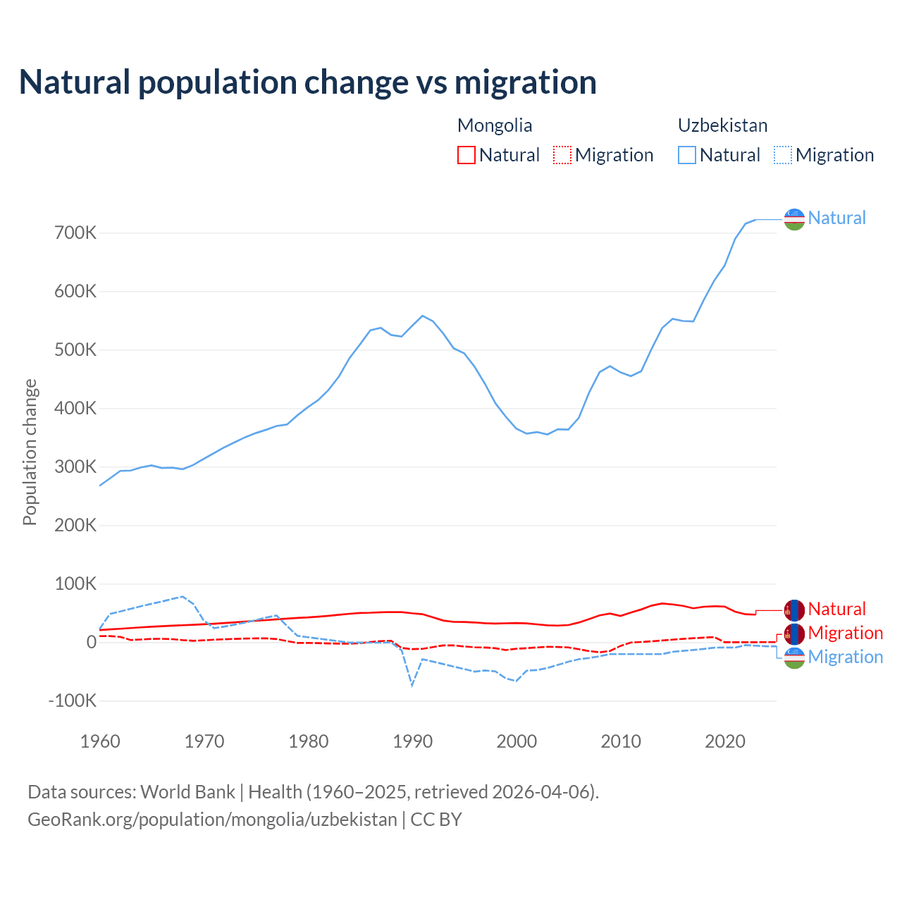 Over the last 10 years, 94.1% of the population change in Mongolia is from natural causes (a gain of 580,367 people) and 5.87% is from migration (a gain of 36,163 people). In Uzbekistan 98.2% is from natural causes (a gain of 6,161,117 people) and 1.84% is from migration (a loss of 115,398 people).