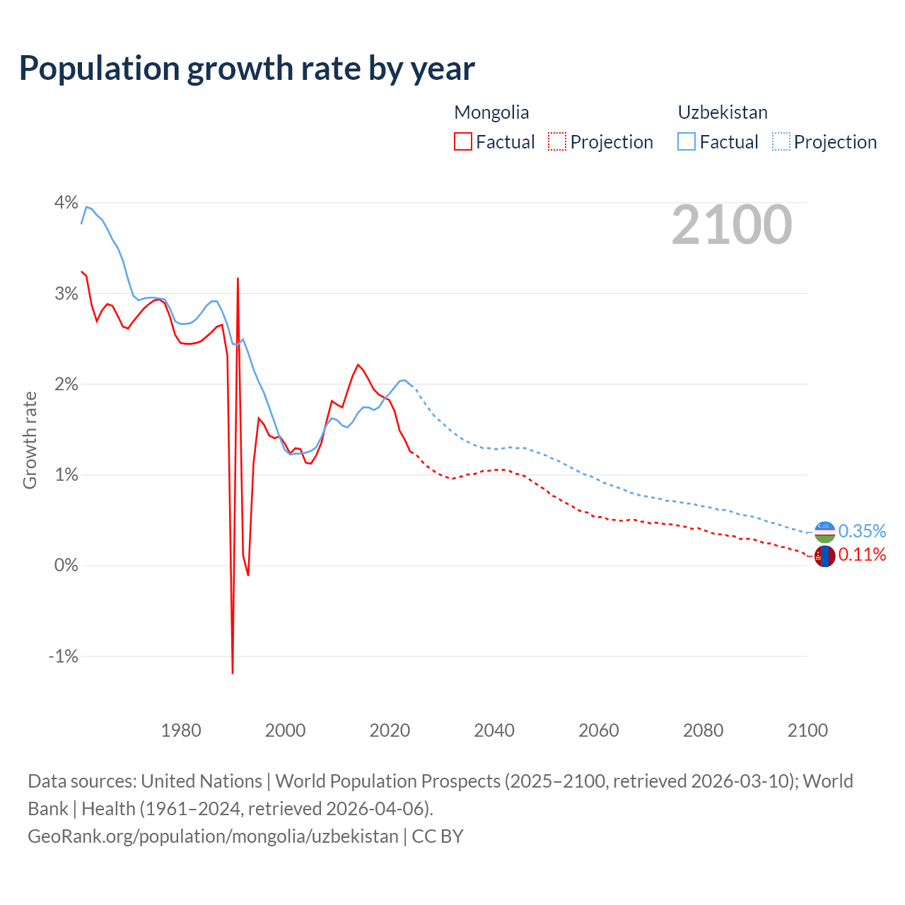 - For the last 10 years, Mongolia has had an average growth rate of +1.79% per year vs +1.85% in Uzbekistan.