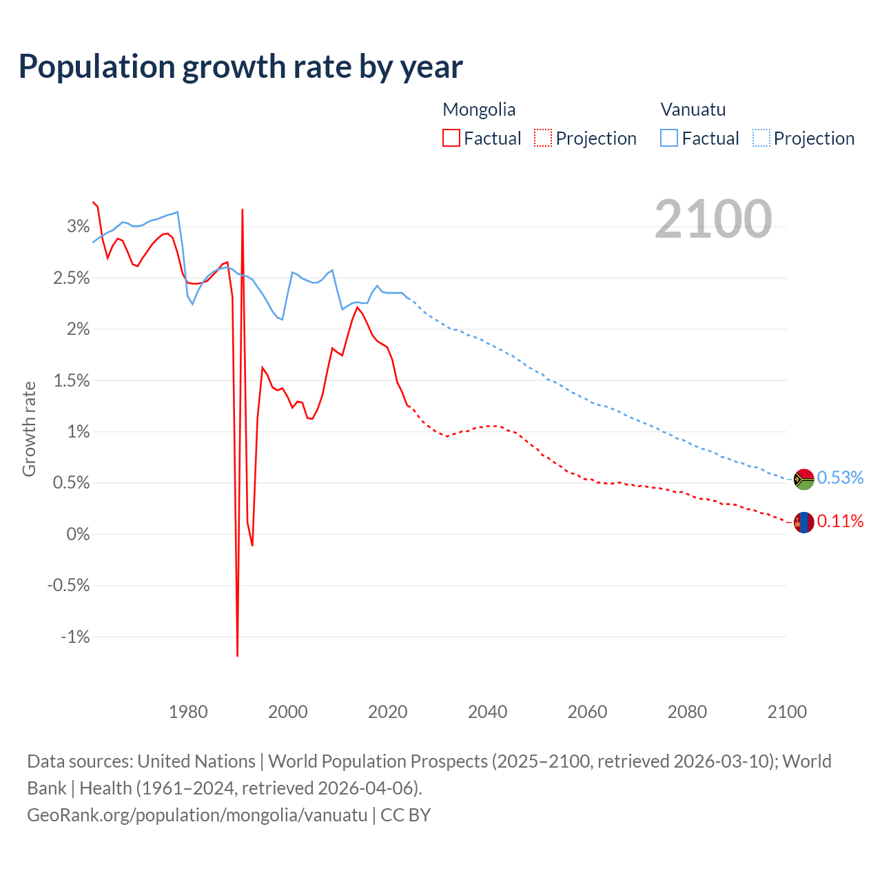 - For the last 10 years, Mongolia has had an average growth rate of +1.79% per year vs +2.33% in Vanuatu.
