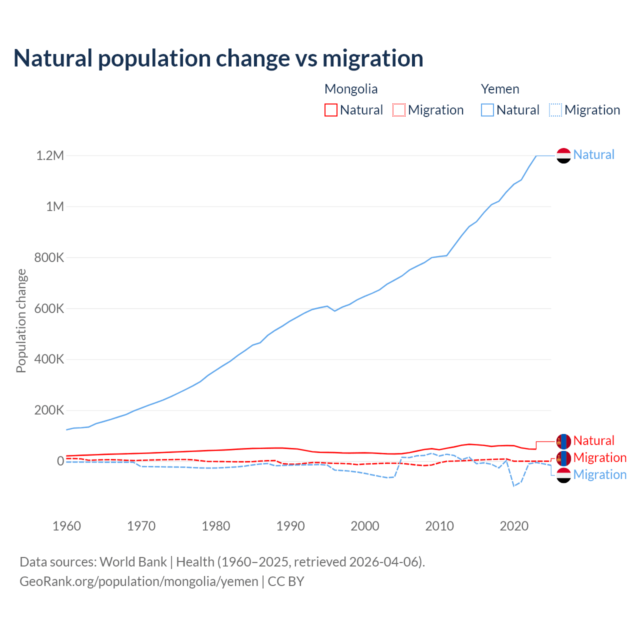 Over the last 10 years, 94.1% of the population change in Mongolia is from natural causes (a gain of 580,367 people) and 5.87% is from migration (a gain of 36,163 people). In Yemen 97.8% is from natural causes (a gain of 10,460,813 people) and 2.17% is from migration (a loss of 231,814 people).
